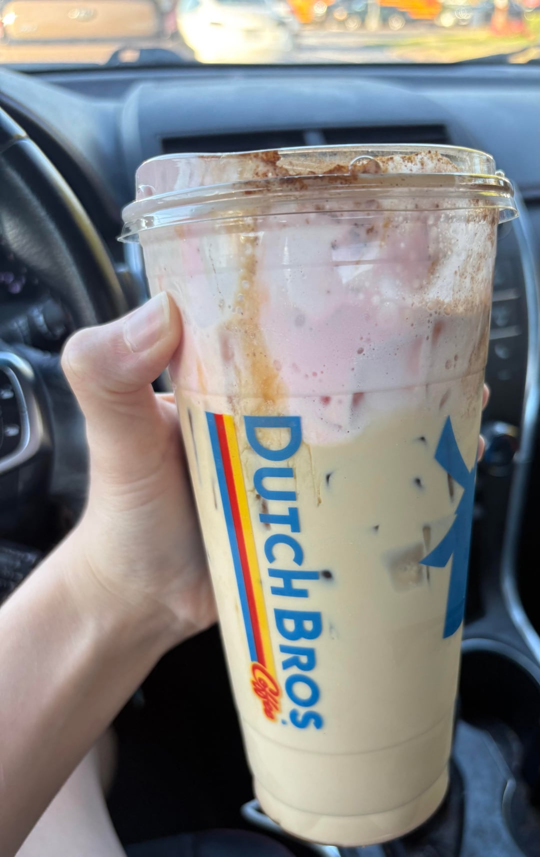 Large iced golden eagle with added cinnamon, strawberry, cookie butter topping and foam.