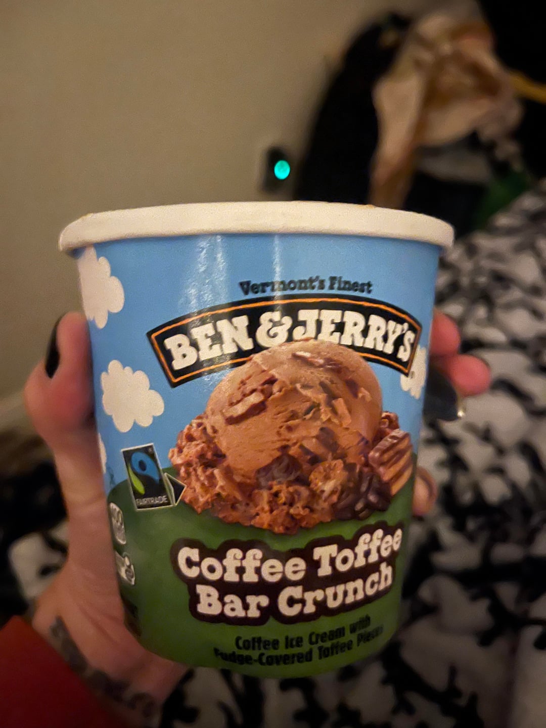 Oh you don’t want the toffee. They are the most rancid disgusting toffee pieces out there. Especially because this amazing flavor used to be Coffee HEATH BAR Crunch and was consistently amongst the top flavors during its entire lifespan. Then they went non GMO, got rid of the Heath Bars and put in this truly vile toffee. To this day, this flavor has one of the worst ratings on B and Js web site from hundreds of people apoplectic about the change. Even if they had just picked a somewhat passable toffee this travesty would have been mitigated but they went from absolute perfection to THIS. Oh and they got rid of the Vanilla Heath Bar Crunch as well at the same time. One of my worst ice cream memories was stocking CHBC every week in my freezer and suddenly one week THIS happened. It’s a collective trauma as well, as many reviews know the exact day they ruined it, it’s seared in our heads.