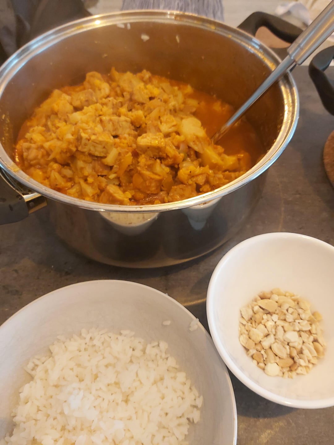 Serve with rice or potatoes and add crushed cashew nuts for crunch. I also threw on a scallion since I had some.