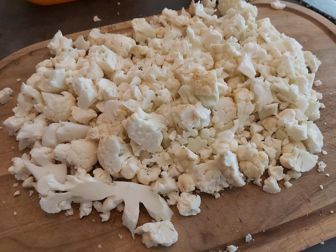- Mince the onion and garlic and fruit them in olive oil in a big pot. (I added the tempeh and chillipeper aswell in this step)