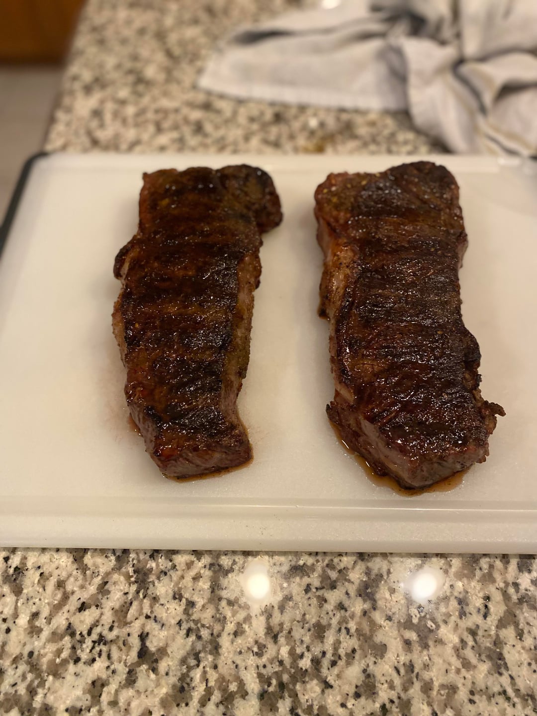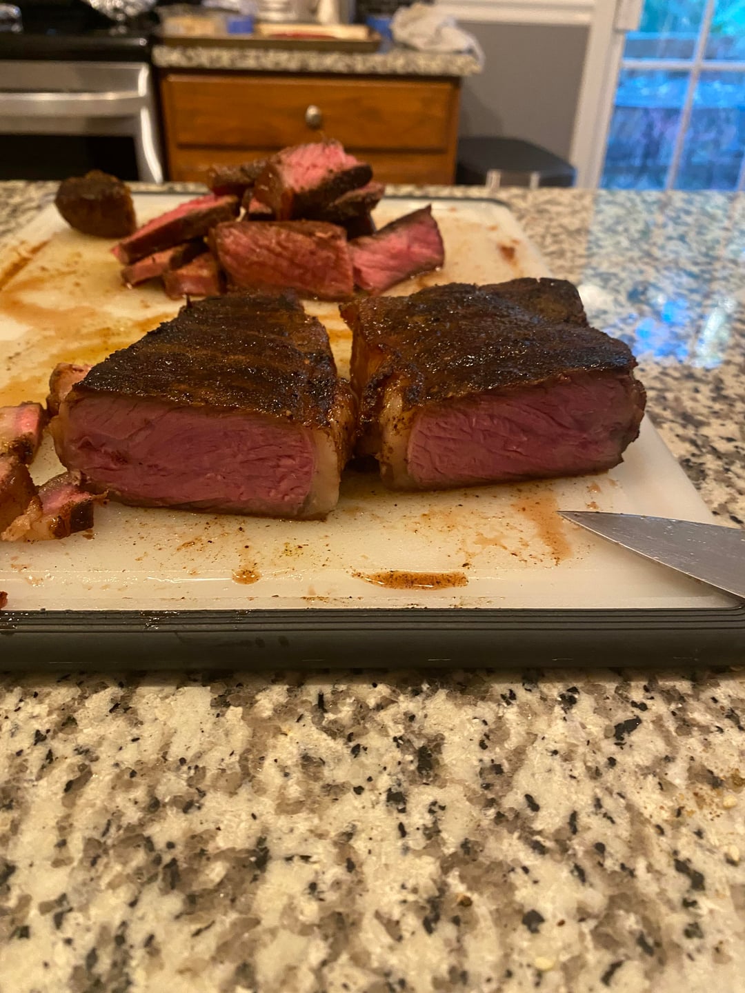 Looks fantastic. Try resting it on a steak rack instead of cutting board. You’ll have less juices escaping during the rest.