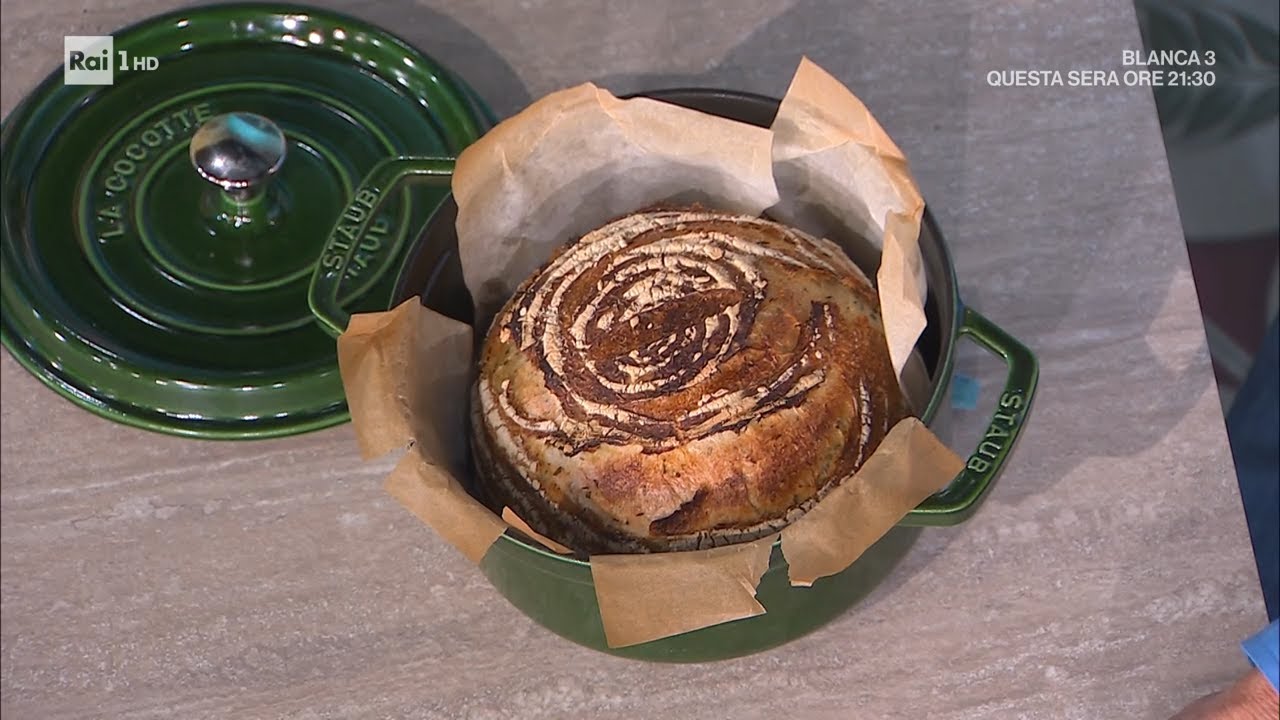 Guardate che meraviglia questo pane fatto nella casseruola. Brava. Facciamo nella pentola in ghisa il pane. Ma quale pane? Facciamo esatto perché è una pianta che a me piace tantissimo. Tra l’altro usamo sempre in pis. Brava. tutti ce l’abbiamo ed è bellissimo utilizzarla anche nel pane, sia nella crosta superiore, ma soprattutto anche andando a eh utilizzarla dentro nell’impasto, perché il rosmarino dà quel sapore e poi soprattutto unito al lievito madre, come utilizzeremo oggi, abbiamo ripreso il lievito madre e la cottura in pentola, che è molto più facile da fare a casa paradossalmente perché oggi parleremo molto di cotture perché a casa, nei forni di casa, utilizzare la pentola è come riuscire a sfruttare al massimo il proprio forno. Quando i nostri forni di casa non sono perfetti, quindi magari perdono magari temperatura rispetto ai forni professionali, la pentola in ghisa ci aiuta ad avere una crosta croccante, avere un pane che eh cuoce molto meglio. Ti farò vedere come utilizzarlo. Partiamo dall’impasto. 500 g di farina tipo 2. Facciamo un pane rustico e quindi un pane che abbia una farina non eccessivamente bianca e che sia pronto per essere conservato per lungo tempo. 330 g d’acqua e iniziamo ad impastare acqua e farina. semplicemente due parole sul lievito madre che ho qua. Il lievito madre, in questo caso il lievito madre liquido che ormai utilizziamo già da sempre, è importante, prima di utilizzarlo, andarlo a nutrire con acqua e farina. Quindi abbiamo preso una parte di lievito, la stessa parte nel suo peso in farina e la stessa in acqua, quindi rapporto 1 1 1 L’abbiamo miscelato e l’abbiamo fatto raddoppiare di volume, quindi era qua a questo livello. Quando raddoppia di volume è pronto per essere Quando abbiamo iniziato il 2020, ti ricordi che venivamo dal lievito e no post Covid, quindi insomma spiegato è stata una vera e propria rivoluzione. Se uno non avesse lievito madre, nessun problema. 8 g di lievito fresco di birra in questa ricetta. Vedi che io sto facendo scendere 500 g di farina. Quando potete, magari non ce l’avete in casa, però prendetelo ormai il panettiere c’è deve averlo. Certo, io nel mio panific lo regalo che viene con il contenitore a prenderlo. Che bello. Ne mettiamo 150 g per 500 g. Tanto che adesso verranno tutti a prendere il lievito madre da te. Ma basta che venite col contenitore, me lo dite un po’ prima per in tanti. Lo impastiamo. Io naturalmente poi metterò il sale a rosmarino, te lo faccio vedere dopo. Andiamo avanti con l’impasto perché la prima lievitazione sarà abbastanza lunga. 3 ore a temperatura ambiente e sia. Pane a rosmarino. Siamo arrivati a un punto arrivati a un punto esatto, no? all’impasto fatto con farina, lievito madre, eh l’acqua. Adesso siamo al momento in cui andiamo a inserire il rosmarino, quindi mettiamo 40 g di rosmarino e il sale. Andiamo ad inserirli quando l’impasto ha già preso una bella consistenza. Intanto stiamo vedendo semplicemente l’acqua al lievito. E adesso siamo abbiamo parlato del lievito madre. Esatto. L’importante è aggiungere rosmarino, sale, un pizzico d’acqua quando l’impasto è già bello formato. Naturalmente poi impastando lo facciamo assorbire. ci vogliono circa una decina di minuti come sempre. Però è importante ricordarsi questo di passaggio, no? Non mettere rosmarino all’inizio. Prima lievitazione, coperta da pellicola nel contenitore, 3 ore a temperatura ambiente. È un pane anche facile e anche abbastanza veloce da fare a casa, perché il lievito madre è vero, ha dei tempi leggermente più lunghi, ma in un pomeriggio questo pane lo possiamo fare. Benissimo. E poi questa cosa del pentolino, eh, ricordiamo. Esatto. Adesso abbiamo la pentola in ghisa che io consiglio a tutti di avere perché è un investimento magari importante all’inizio, ma dura veramente una vita e quindi la compri una volta e ce l’hai. Da questo pane faremo due pagnotte da questo impasto, proprio perché la pentola in ghisa è, diciamo, di queste dimensioni, no? Cioè, se ce l’abbiamo più grande, naturalmente possiamo Andiamo a chiudere bene il nostro eh pane in questo modo e prendiamo, io utilizzo i cestini per la lievitazione, i belli infarinati e andiamo a inserire il nostro pane dentro. Uno e 1 du. Quindi siamo l’impasto da 500 g di farina che viene circa 1 kg totale con tutti gli ingredienti. Sono due pagnottine da circa mezzo kg. Andiamo a metterle qui e le facciamo lievitare per altre 2 ore. 3 + 2 5 3 + 2 5 ore. Adesso inizia a diventare, guarda, prima e dopo. Adesso diventa la parte più importante. Prendo un tagliere, facciamo preriscaldare la pentola a 240°, cioè forno. Quando il forno si deve scaldare noi utilizziamo, non sprechiamo niente, l’energia per far scaldare il forno, per far scaldare la pentola calda. Poi un piccolo consiglio per casa che si può mettere direttamente nella pentola, ma io consiglio di prendere due pezzi di carta forno in questo modo, mettiamo un pizzico di farina e facciamo il cavaliere, no? Quello che si fa spesso per le torte. Facciamo scendere. Questo ci aiuta perché se vogliamo andare a tagliare il nostro pane è un po’ più facile. Quindi andiamo con il coltello, in questo caso a sega, a fare un taglio al pane. Pentola calda. Andiamo a prenderlo in questo modo sotto, guarda. E lo mettiamo direttamente dentro. Così. Coperchio. Attenzione perché è ustionato. Esatto. Sì, sì, dobbiamo farlo a pentola calda, eh. Mettiamo il coperchio e poi andiamo in forno a 240° per 40 minuti. Cioè il forno rimane a 240°. E con la ghisa, naturalmente, ha un raddoppio di calore. No, gli ultimi no, ma mantiene il calore. Mantiene il calore gli ultimi 10 minuti, Antonella, bisogna togliere il coperchio perché sarà quella parte che ci darà la possibilità di fare quella bella crosta. Qui viene una cottura praticamente professionale perché Guarda che meraviglia di fame. Vieni per questo viene chiamato proprio eh il seco