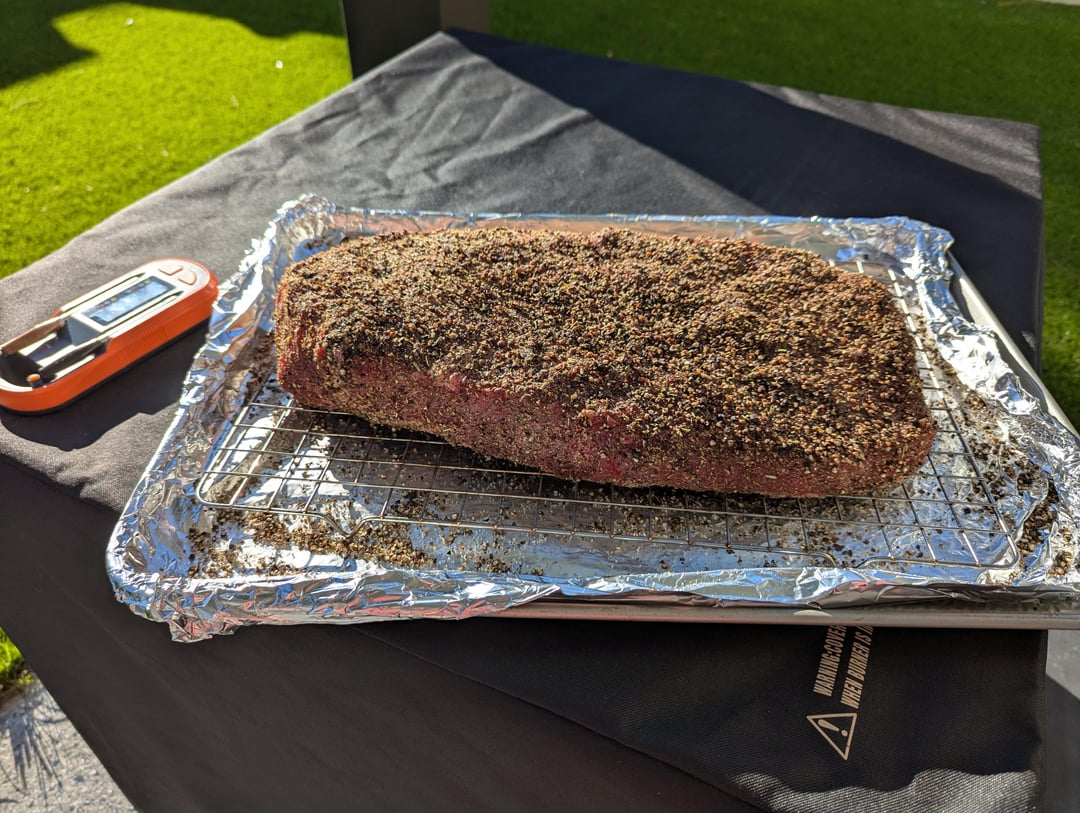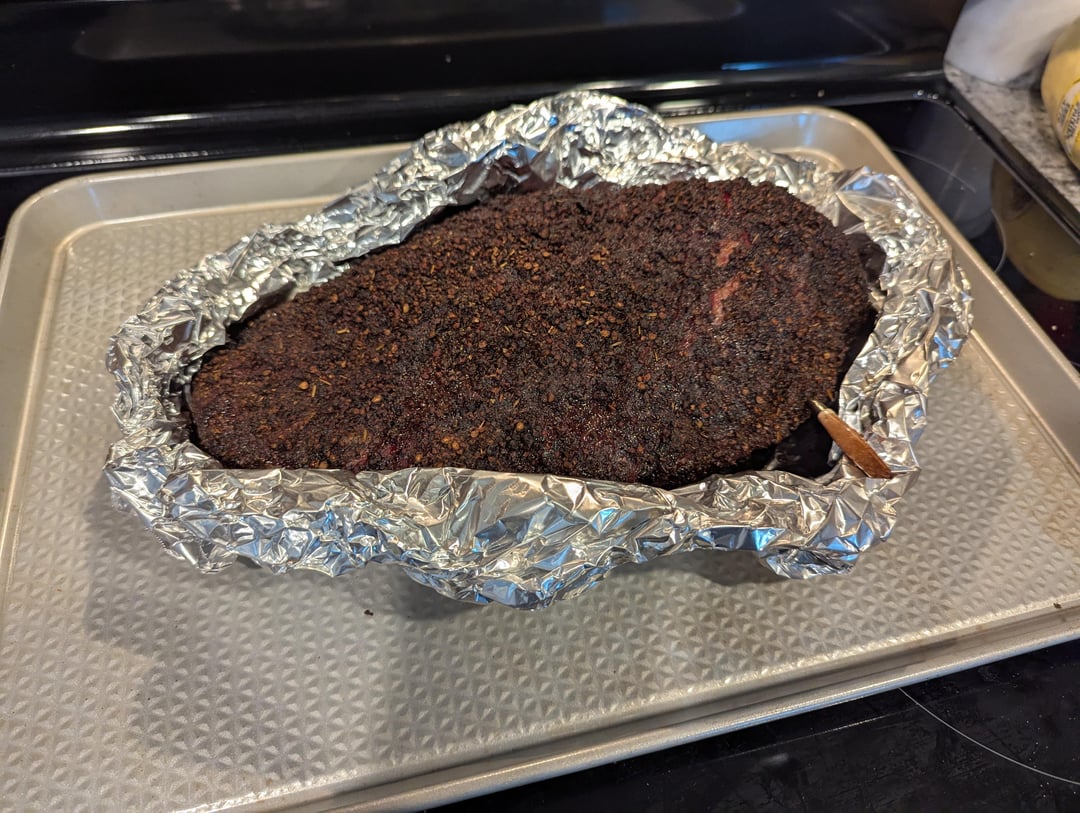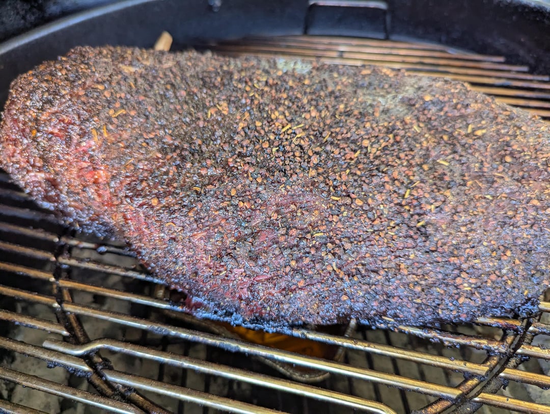First time smoking a brisket on my new 22! 10lb from Costco trimmed down, Diamond kosher and coarse hand ground pepper only, no binder. 2×1 snake method for a steady 225-250, which timed out perfectly – it died about 20 minutes after I pulled the brisket off the grill. Started at 9:30am, came off the kettle about 6pm and rested in a cold oven til 8pm for dinner.