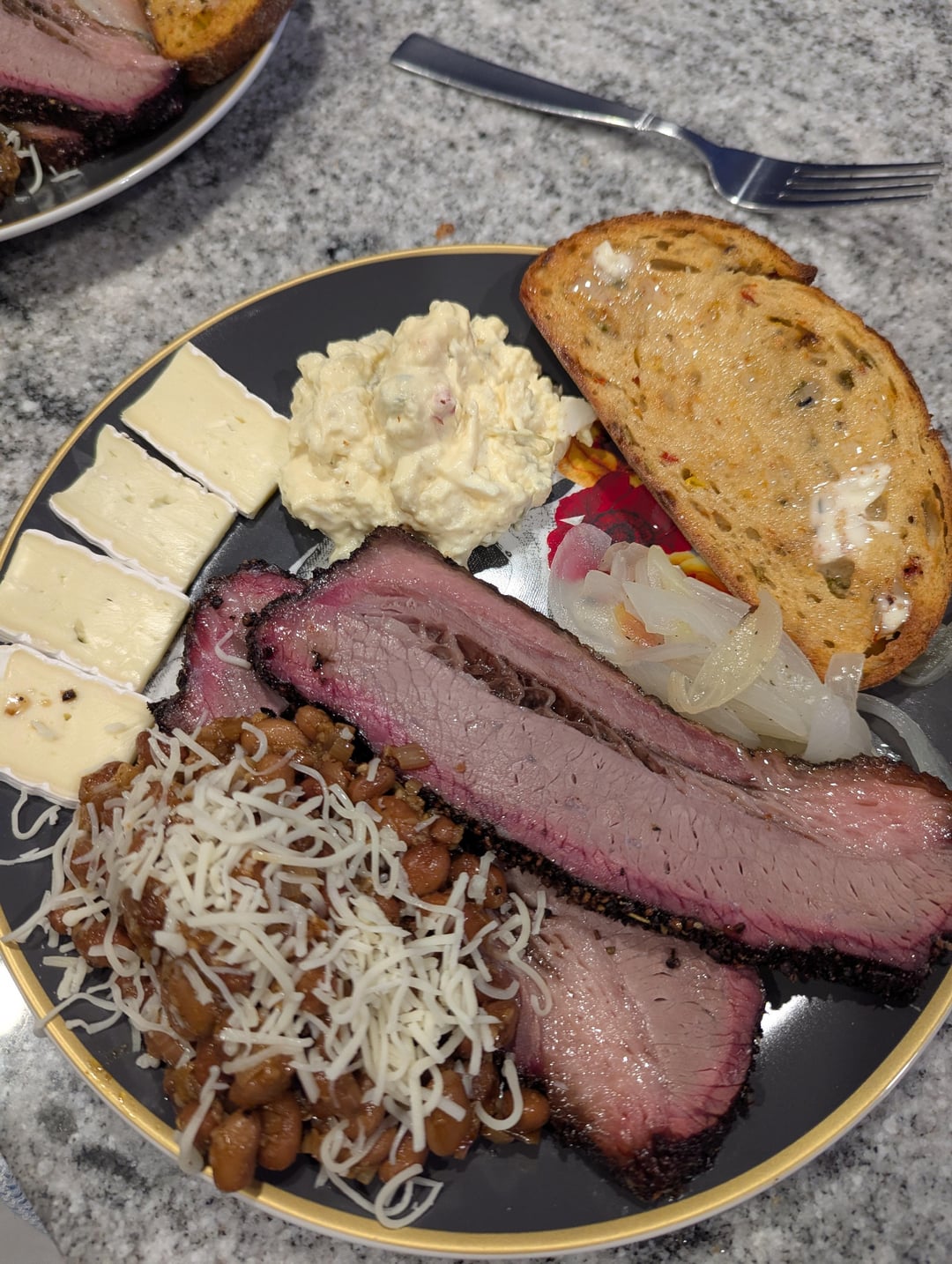 Holy hell I cook a lot and this is easily top 3 best things I've ever made! Super tender and juicy, fat rendered down to Jell-O texture, smoky without being overpowering. Didn't even need a BBQ sauce drizzle. Served with blackened onion, pinto beans, potato salad, jalapeno cheddar bread, and triple creme brie (couldn't find any cambozola sadly.)