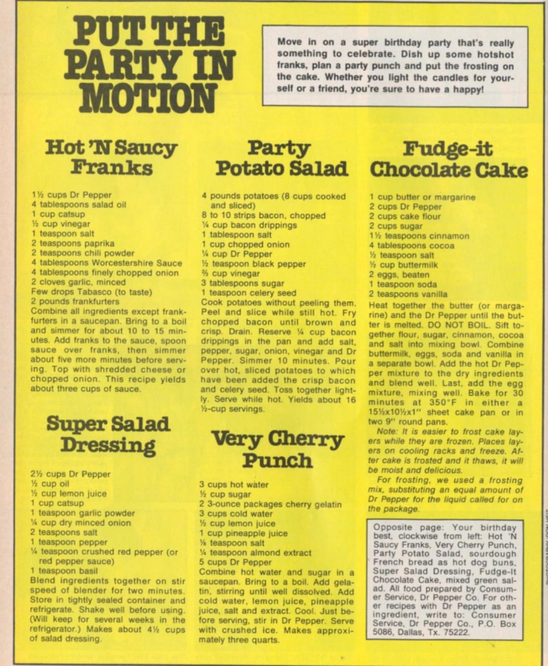 Opposite page: Your birthday best, clockwise from left: Hot N Saucy Franks, Very Cherry Punch. Party Potato Salad, sourdough French bread as hot dog buns. Super Salad Dressing, Fudge-It Chocolate Cake, mixed green salad. All food prepared by Consumer Service, Dr Pepper Co. For other recipes with Dr Pepper as an ingredient, write to: Consumer Service, Dr Pepper Co., P.O. Box 5086, Dallas, Tx. 75222