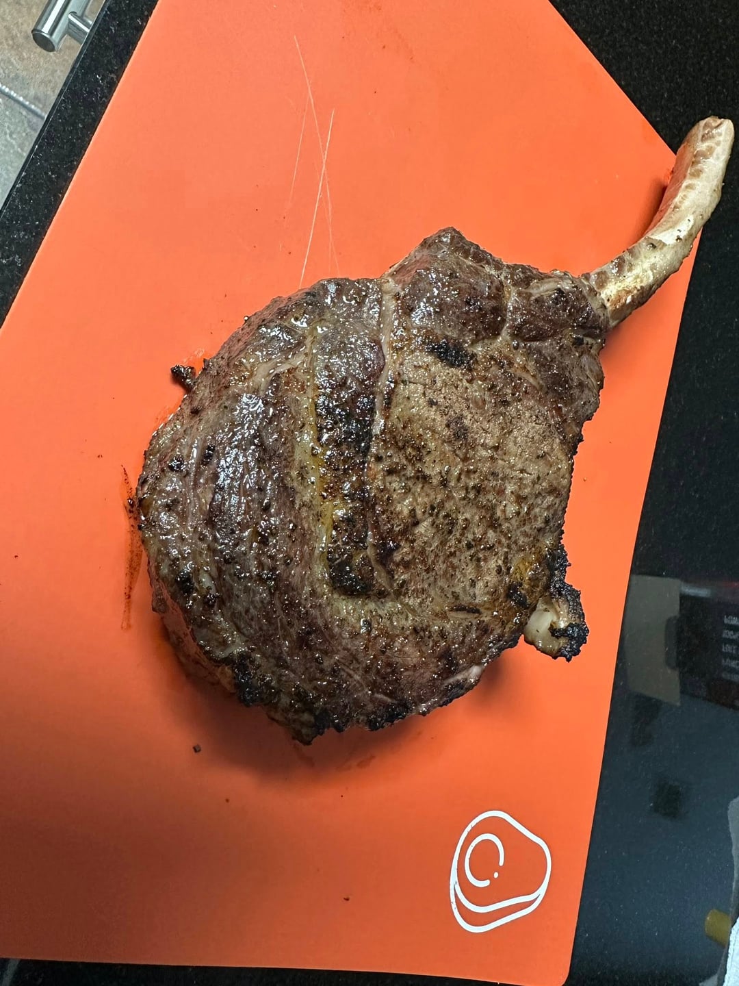 I've never considered getting a tomahawk before, but I wanted to do something new with my virgin sous vide setup. Salt, pepper, and garlic powder. Sous vide for 4 hours at 135f and seared over charcoal. I'm sold. My wife said it was the best steak she's ever had and that there was no reason to ever go to a steak house again.