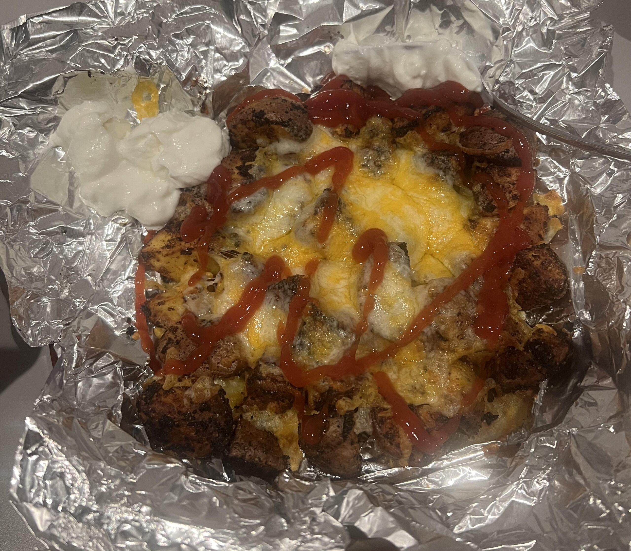292 g of small yellow potatoes cut up. toss is a tsp of olive oil, paprika, garlic powder, and salt. air fry for 20 minutes at 400. i topped with my favorite sliced aged cheddar and then some mexican cheese. air fry on roast on 350 2 minutes. remove add up to 3 tbsp of ketchup and 75g of non fat plain greek yogurt.