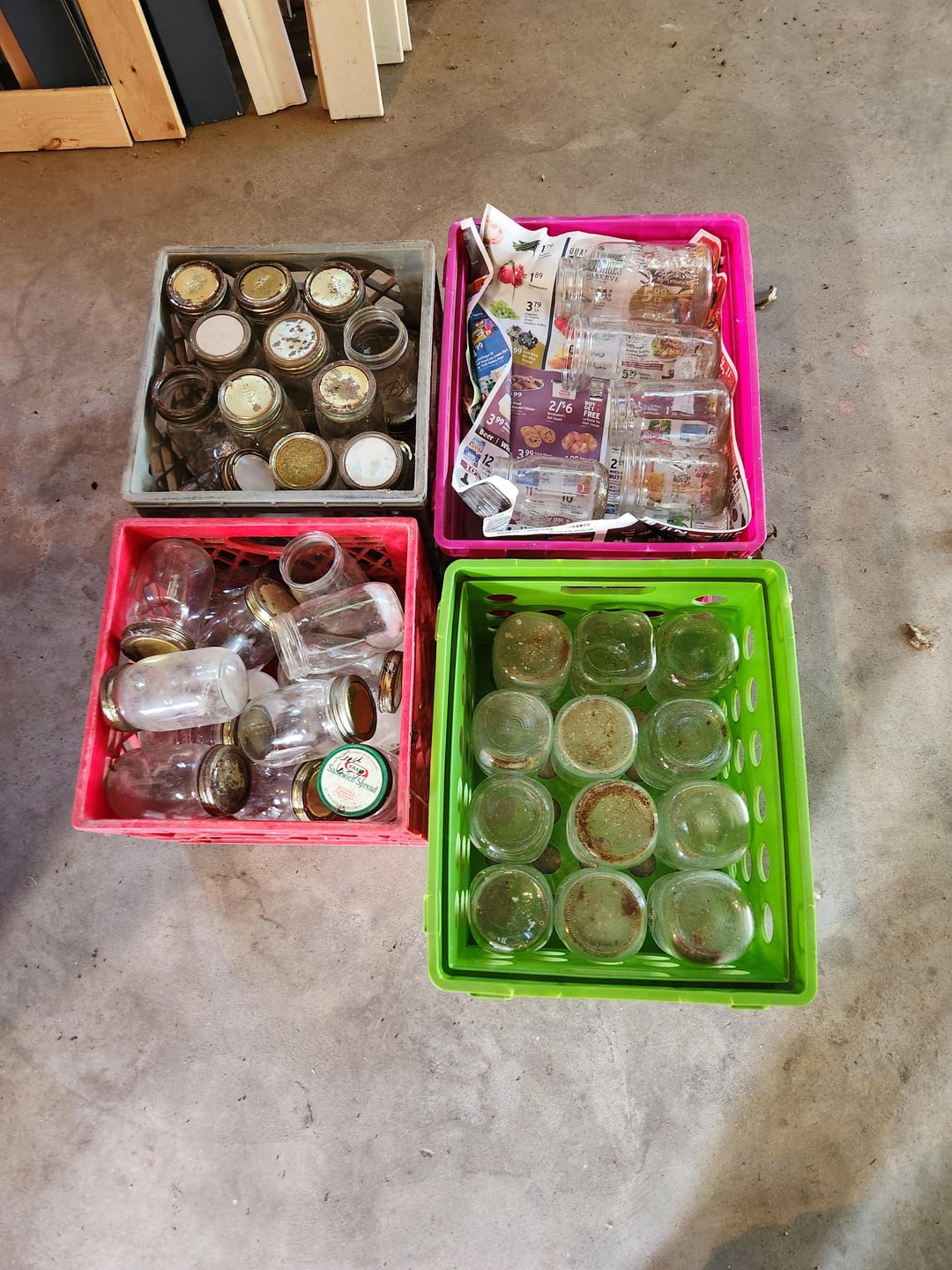 Four crates of jars with barn 'patina' (thats a combo of dust and spiders, dear reader)