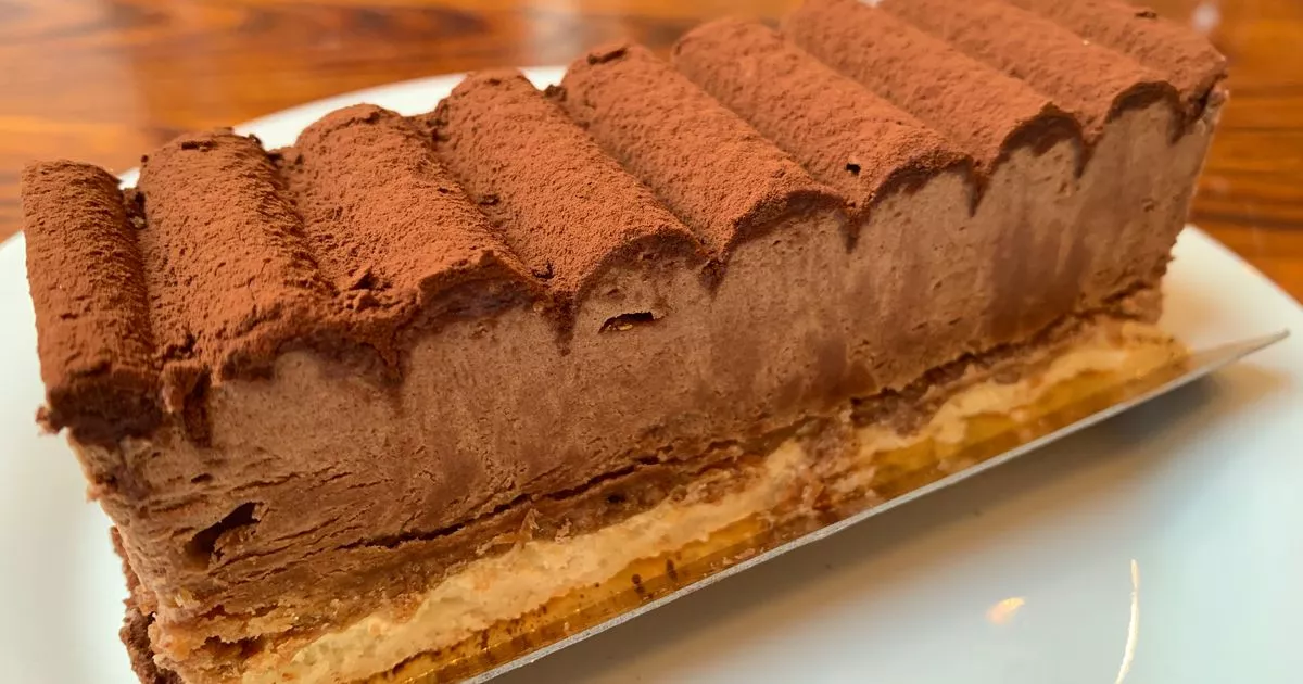 The French classic comprises three layers – on the base, a chewy nut meringue sponge cake (dacquoise) then a layer of crunchy praline, and finally, a thick layer of rich chocolate mousse.