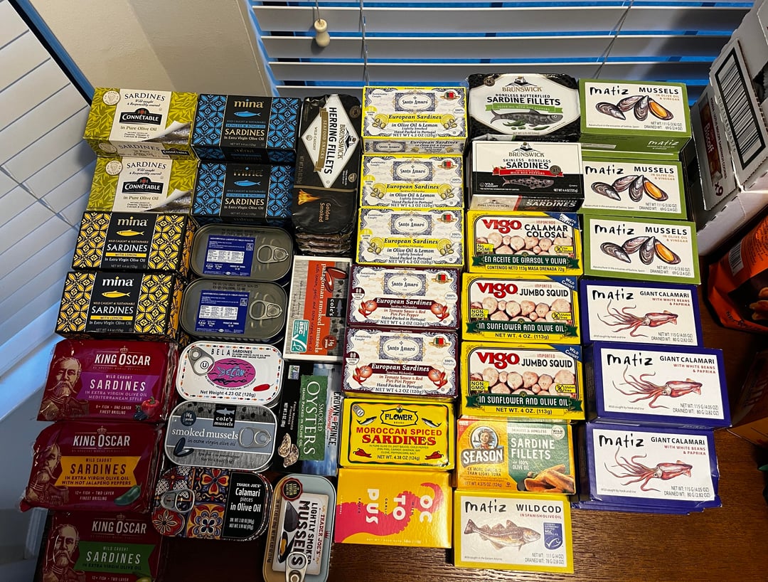 $30 & 30 min later I have a wonderful display of tinned delicacies. Wife was tired of them being splayed out on top of the breakfast table. Found a really nice book shelf on Amazon to hold all 114 tins. It could probably hold another 30.