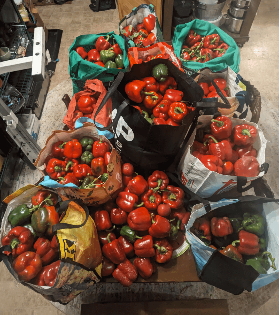 I took a bag earlier before I understood the scale with the idea of just making a few jars of red pepper sauce. And then I thought oh I guess I could also make some red pepper jelly. But this is a monumental amount of peppers. This is like a few hundred pounds of peppers. My dumbass that can't stomach waste literally filled every single bag I had in the house with them.