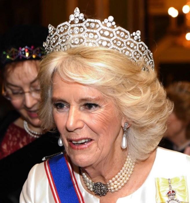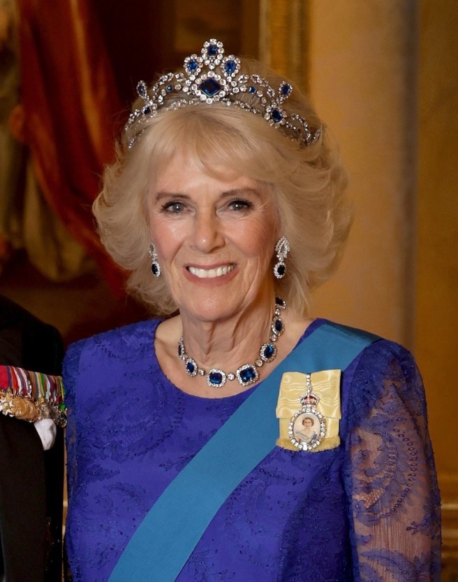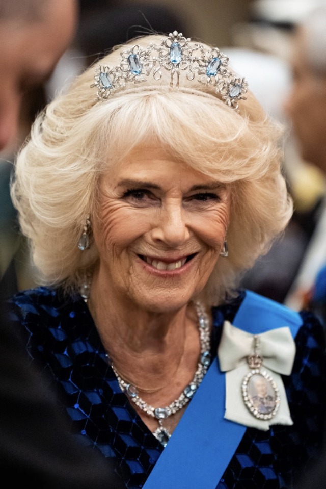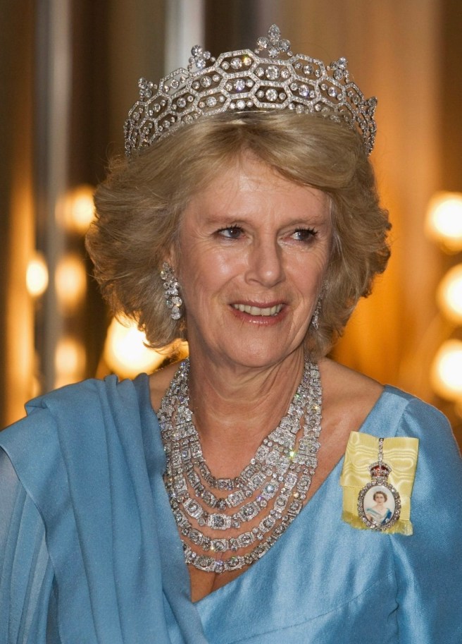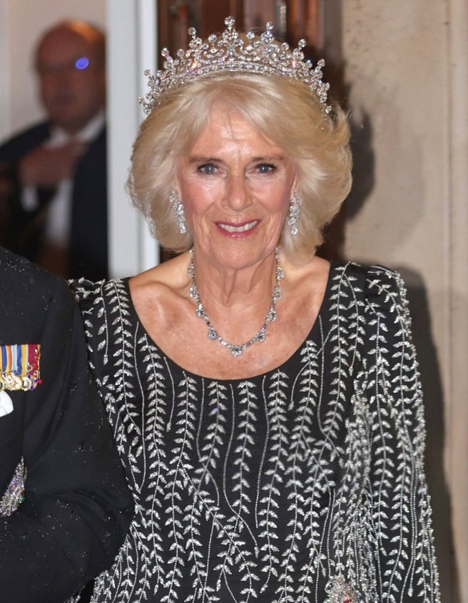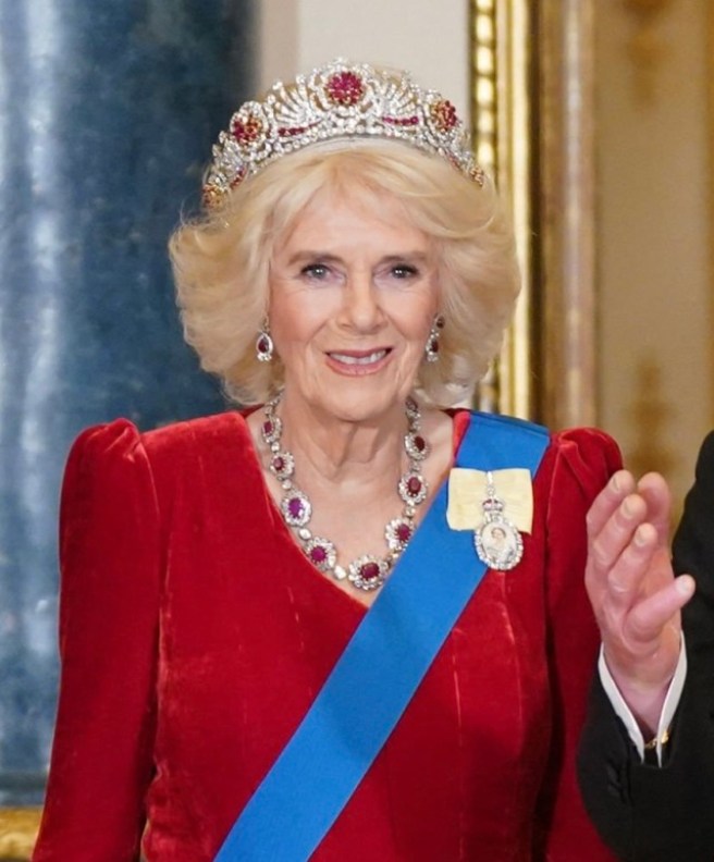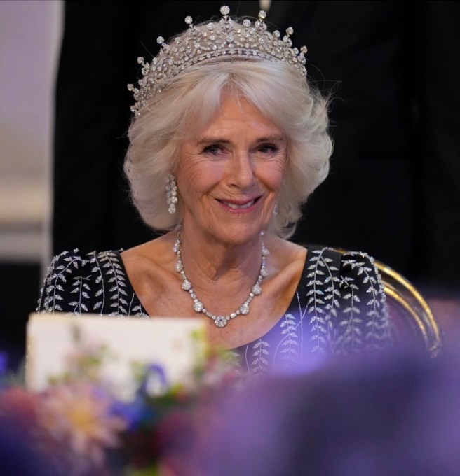 Queen Camilla wore her Diamond Serpent Necklace along with two of the Queen Mother’s Cartier Bracelets.