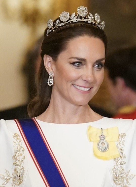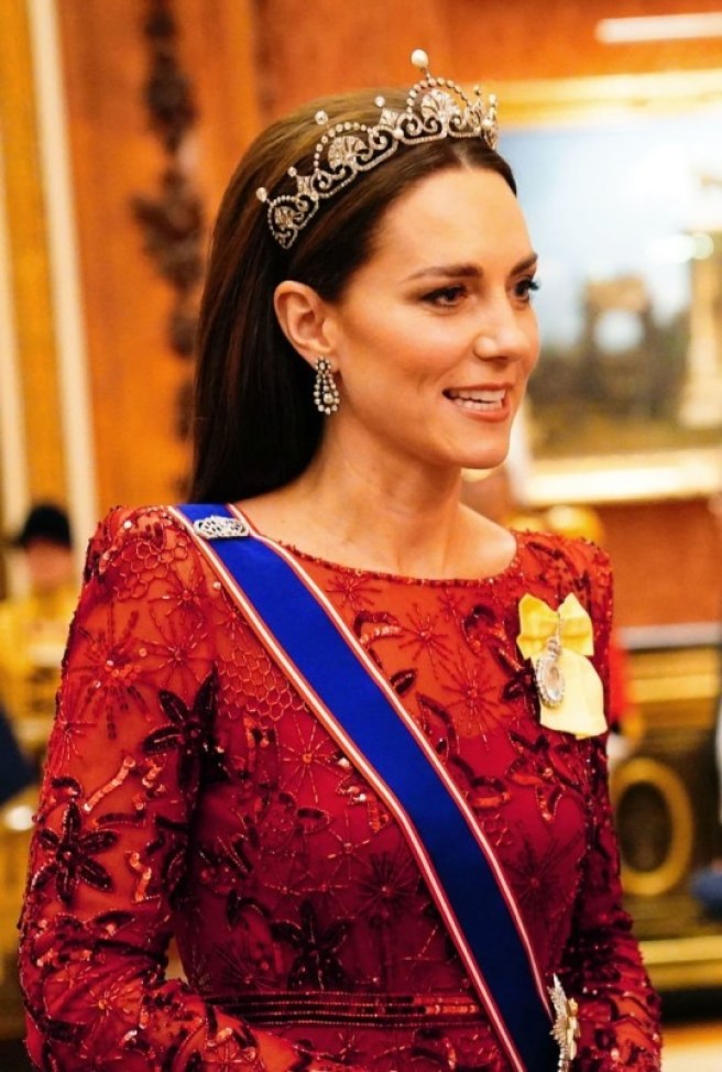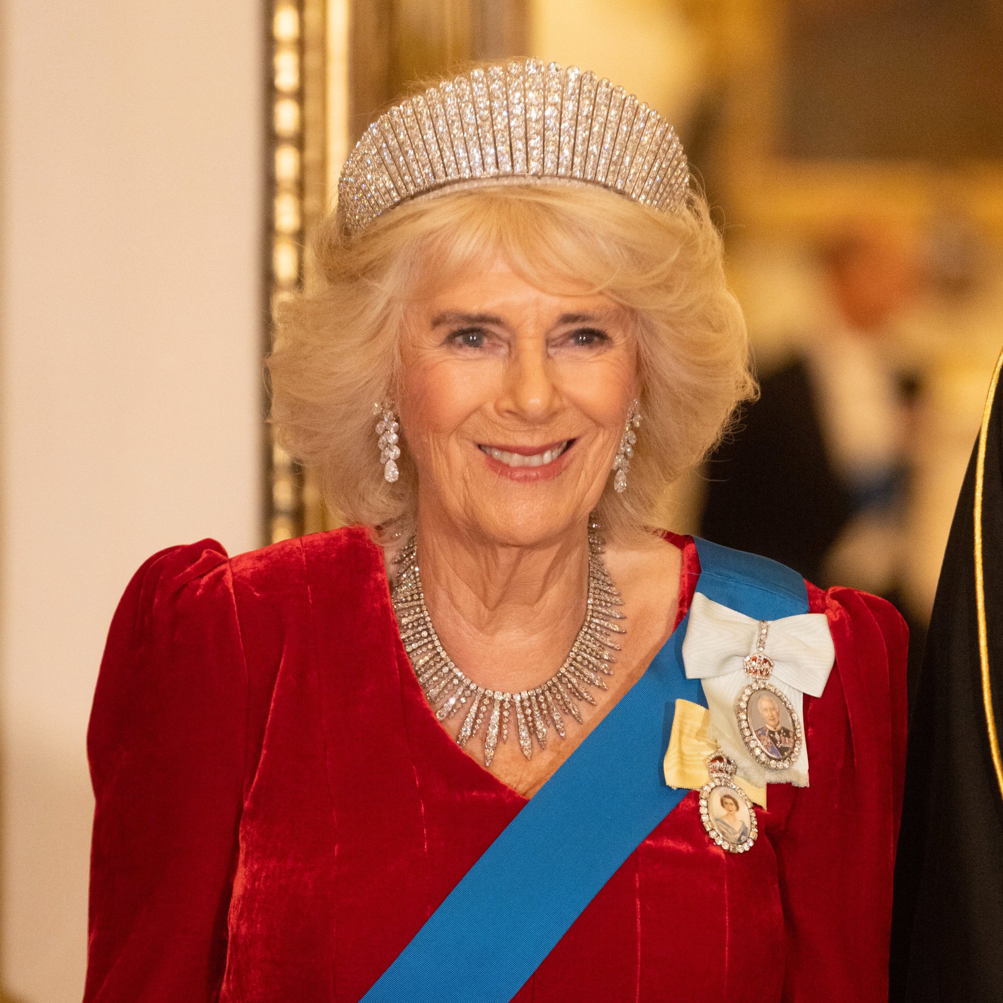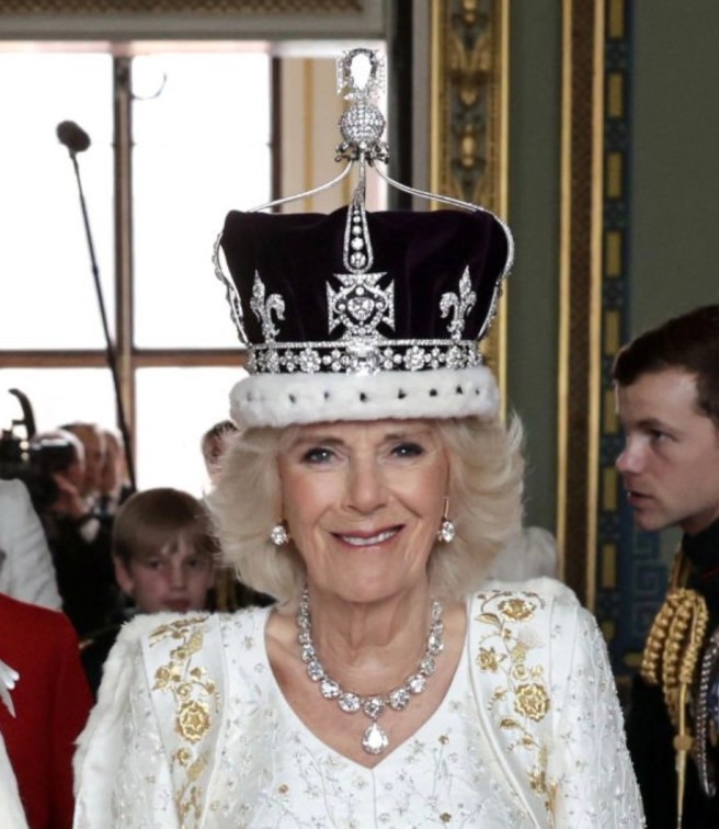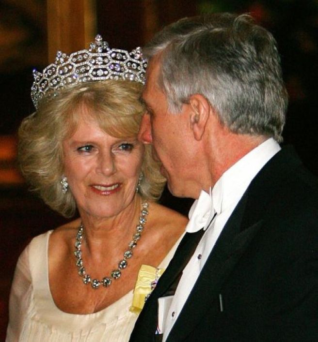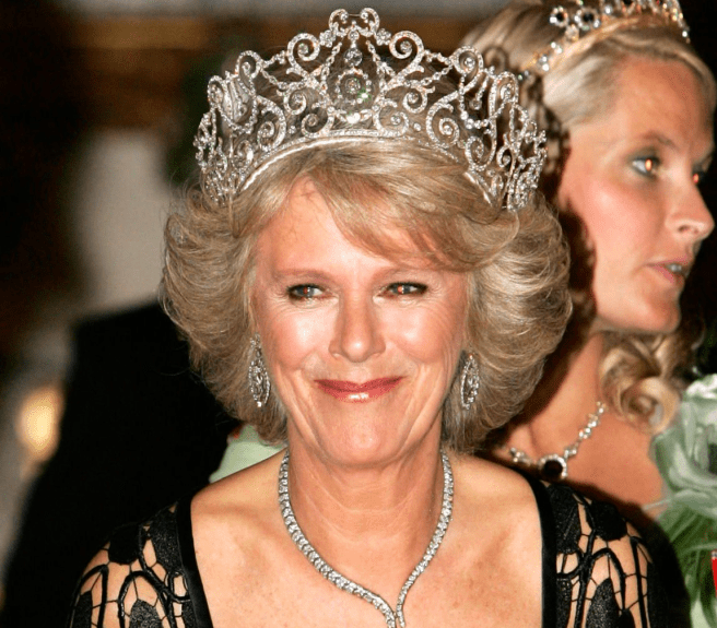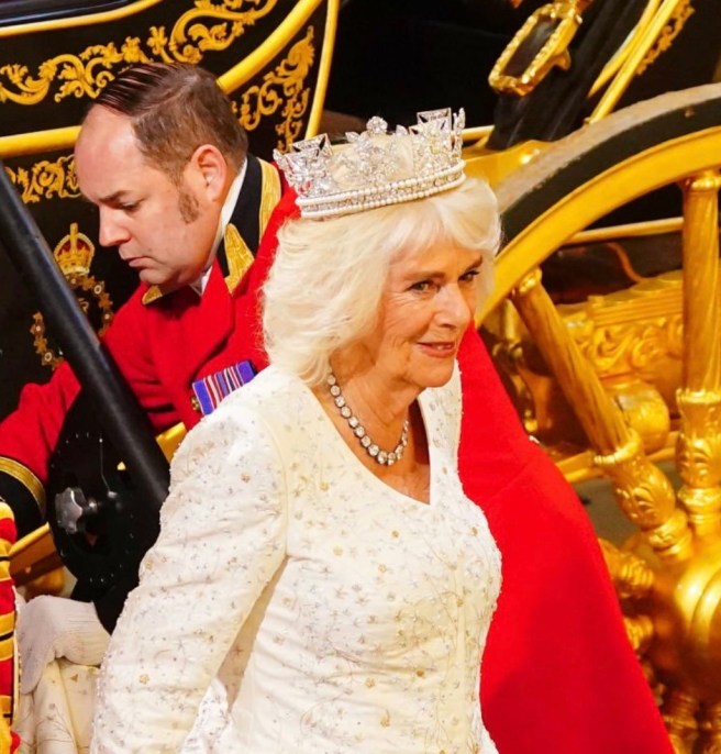 Queen Camilla wore her Diamond Serpent Necklace along with two of the Queen Mother’s Cartier Bracelets.