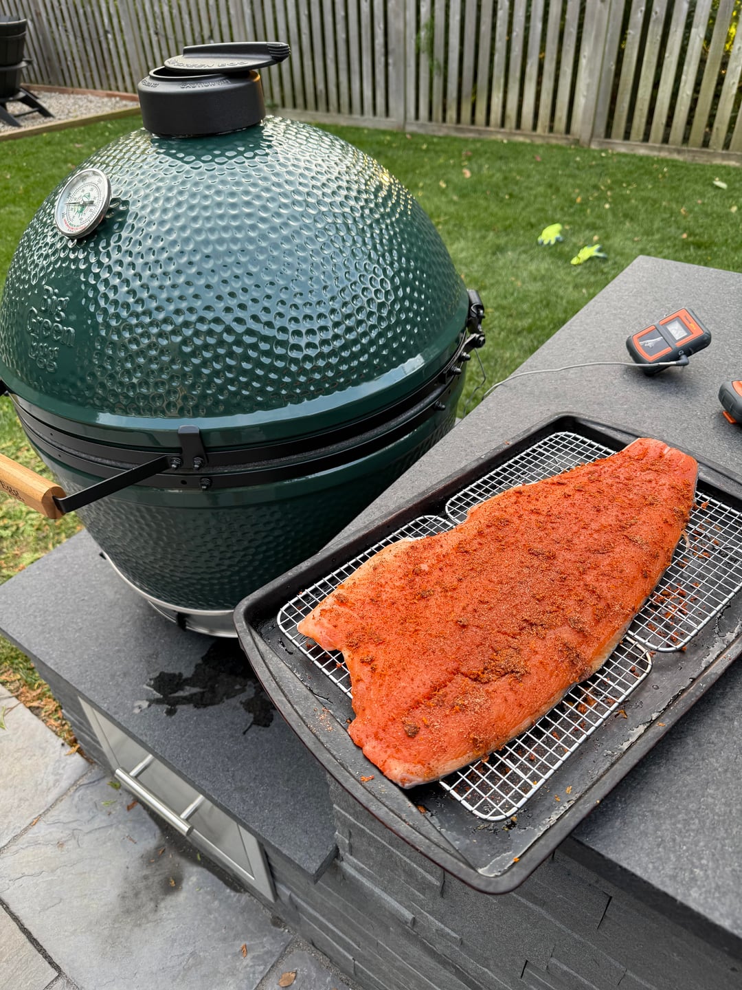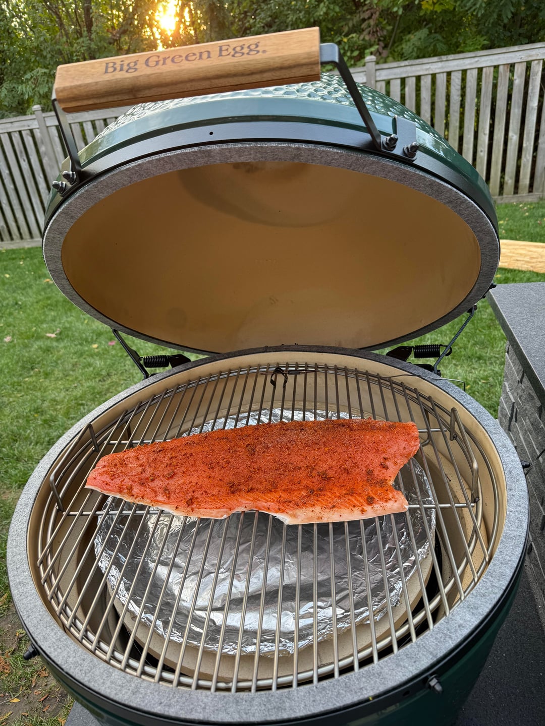 First cook on the egg! Did salmon using the Forks & Embers recipe, which is great. Getting used to temperature control. Not as much smoke flavor. Probably should use bigger chunks next time as I used some of the smaller pieces in the bag mixed through out the charcoal. Still came out great!
