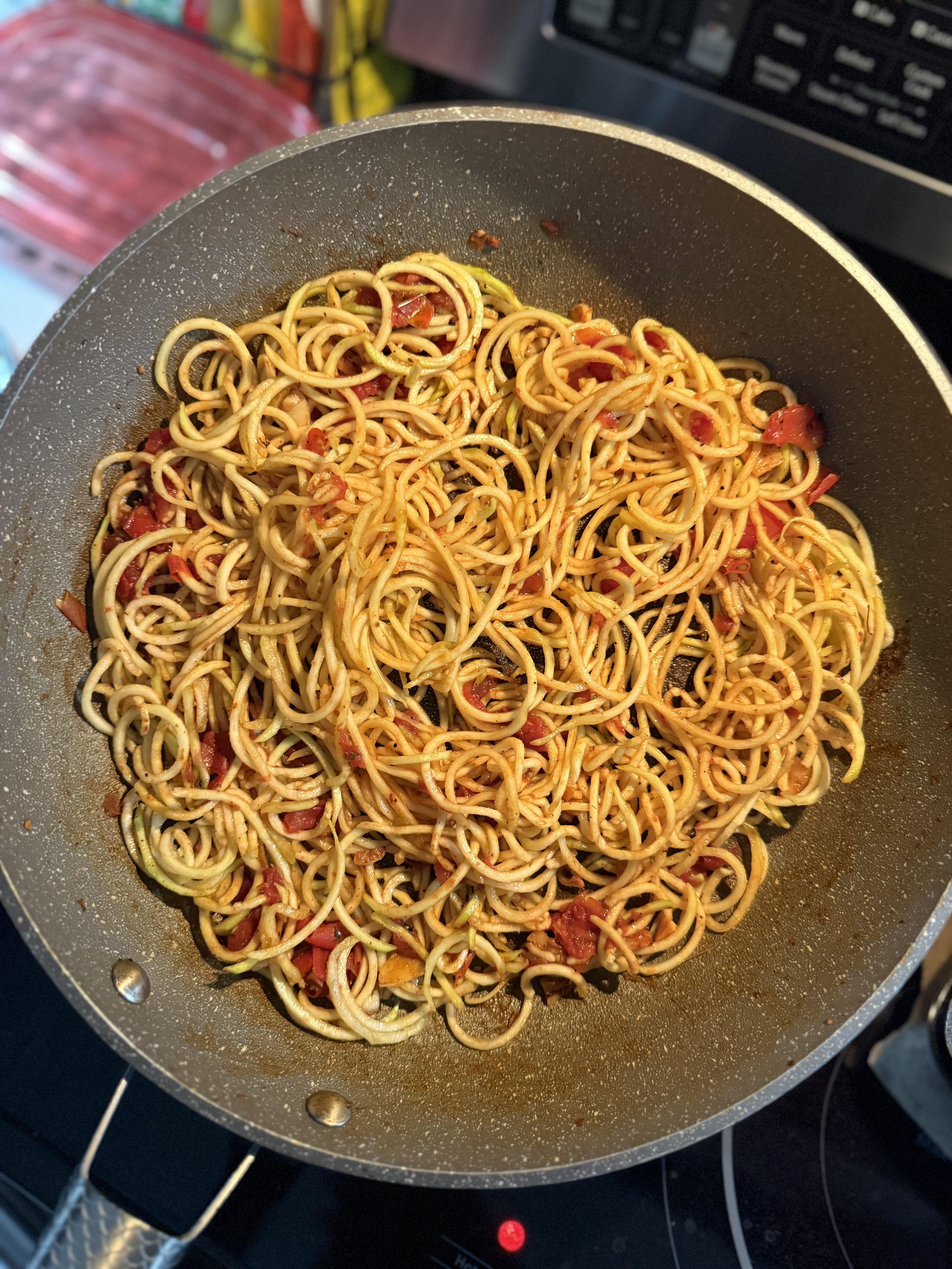 After years of watery zoodles, I finally mastered the recipe. Zucchinis must be very ripe. Prep: Peel the skin off 2 zucchinis, spiralize, pat dry with a paper towel. Cook: In a skillet on med/hi heat, sautee garlic, salt, oregano & pepper. Dice & add in fresh tomatoes (optional). Stir until cooked. Remove off heat and throw in noodles immediately. Toss in pan for 2 mins & add in serving dish. Top w/fresh oregano & basil or fresh cheese (all optional) 🥒🍝