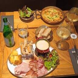 We order a Fondue Savoyard which offers a blend of Emmental, Comté and Beaufort cheeses, and a tartiflette with ham, bacon and Munster cheese.