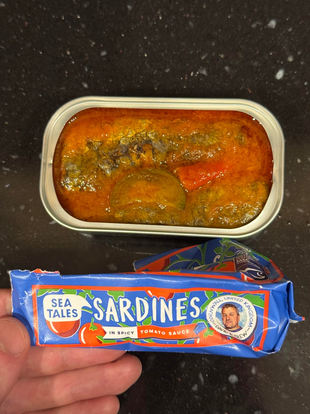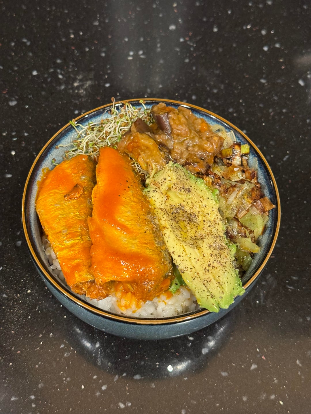 Fish – Sea Tales Spicy Tomato Suave SardinesRice w/ garlic and saltGarnish: sprouts, eggplant in tomato sauce, avocado w/ EVOO salt pepper, fried leekDelicious! by buckbuck24 Dining and Cooking