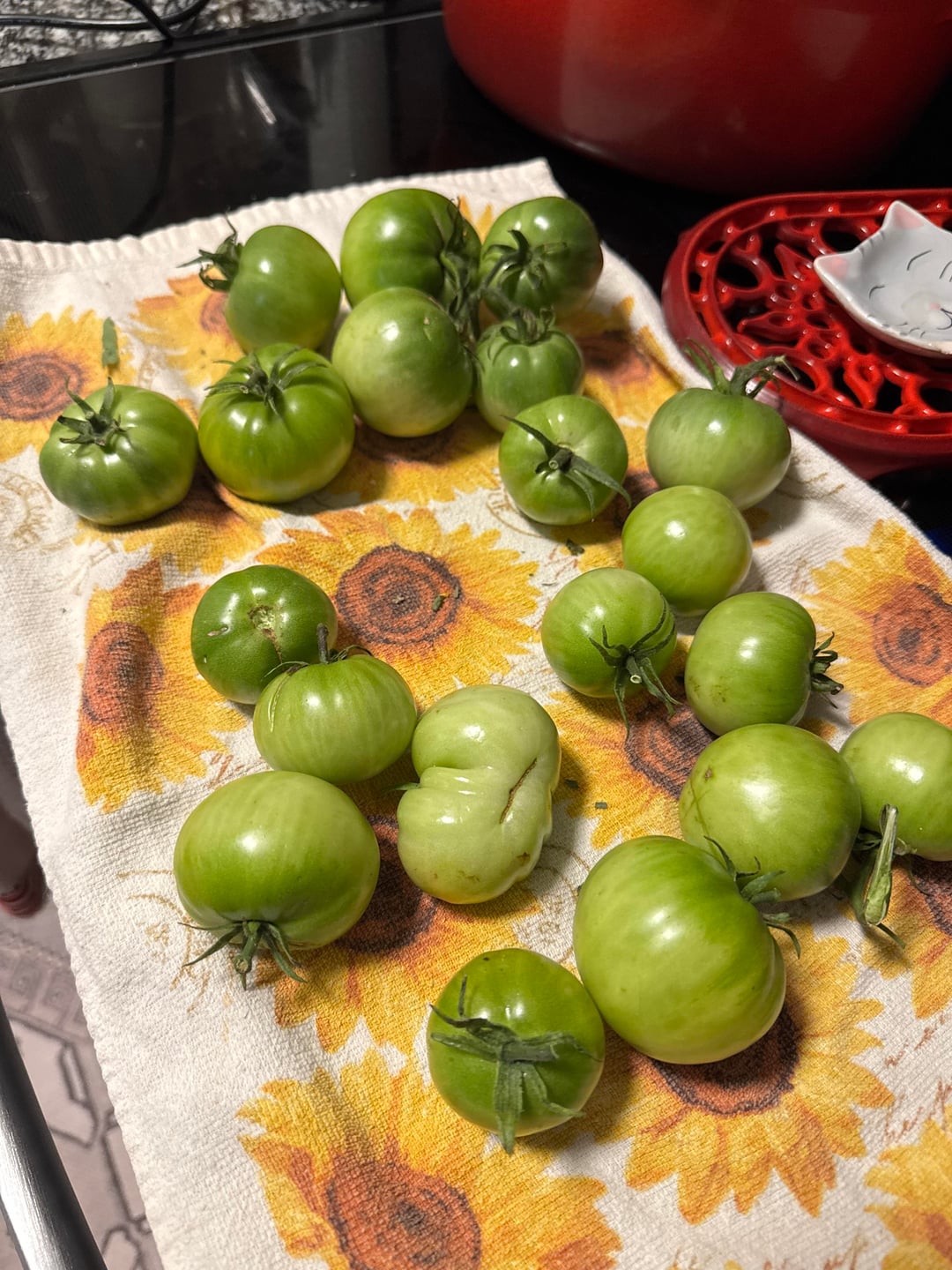 …so I picked all the best and biggest green bebes and it’s going to be a delightful week full of fried green tomatoes. I already did a green tomato pickle relish as well. My Black from Tula is still going strong even after I chopped it in half and having cool nights into the 40s.
