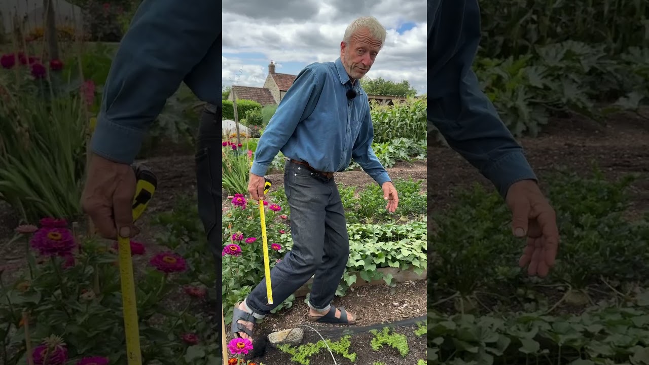 spacing. It makes a fantastic difference to get spacings good and they’re different for every vegetable. Like corettes, which are in the ground for a long time, take a lot of space and moisture. 70 cm I’m giving them. That’s 2 feet and a third. And it looks a lot when you put these little plants in the ground, but boy do they use it all. And we’ve even taken some lower leaves off as you can see which leaves soil that looks bare between the plants but actually the roots are using it all very profitably. Whereas here the slurry obviously don’t get so big. Uh but I’m still giving them quite a decent spacing. It’s around 40 cm. That’s 16 in and it’s an equidistant spacing. So 40 cm always. Uh it’s called planting on the square. So you can see there’s a lot of beetroo plants in that uh sorry plants in that bed. And you you got choices. You you can vary these spacings a bit according to what you want. Like going closer obviously gives you smaller roots. And whereas with something like sweet potatoes here we’re on 70. So I’ll put it this way around for you. 70 cm again just over two feet similar to corettes actually. And that’s only five sweet potato plants there. So they take a lot of space although it takes them quite a long time to use it. Whereas all salad plants I put pretty close 22 cm 9 in is enough for them. And that’s about this one here. You know that a much space for lettuce and eve spinach for salad salad rocket whatever you’re growing for salad leaves they can be packed in quite tight again on the square. Whereas tall plants like these climbing beans, there’s so much leaf there, so much photosynthesis happening that they need a lot of root run. You can see there’s a nice little bolotti beans there on each plant. And it would be a mistake to cram these in close. So there’s only six plants per tepee and between each tepee is 1.2 m or 4 feet and I think I could have gone even a bit wider there. I love to put a maragold or two in the space between. Finally, we have multis sewn, which changes it a bit because you got several plants together, not plant them quite so close as you might if it were singles. And I do beetroot at 30 cm, 1 foot, four in a clump. So, actually, there’s a lot of beetroot. You could also do the same for onions and radish and turnips. Sorry, radish is half the space turnips. So, you can fit a lot of plants in. It’s really good to have these spacings in mind when you come out with your plants and it just makes the whole process go much more quickly. Efficiently.