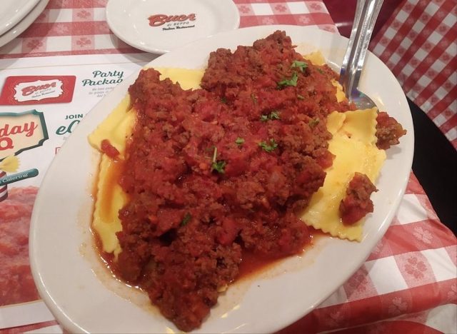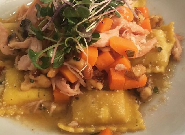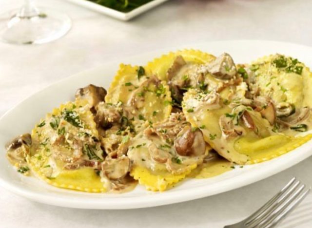 Romano’s Macaroni Grill offers two different versions of ravioli on its menu. First is a mushroom ravioli, made with porcini-stuffed fresh pasta, caramelized onions, and a marsala cream sauce. For seafood lovers, there is a non-traditional seafood ravioli. This dish has seafood-filled pasta, Roma tomatoes, asparagus, lemon butter, and shrimp. “The mushroom ravioli with caramelized onions is something I’ll wake up in the middle of the night craving,” one TripAdvisor user commented. Another reviewer maintains the seafood ravioli is “flavorful and fresh.”6254a4d1642c605c54bf1cab17d50f1e