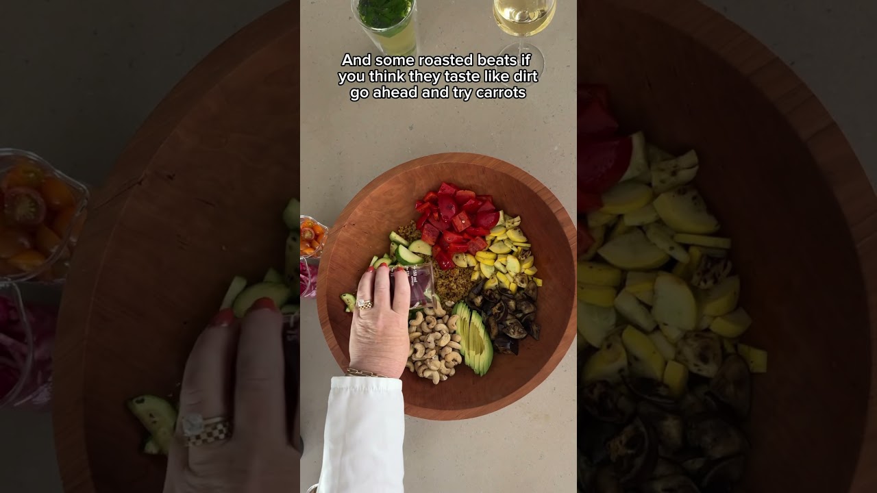 This warm roasted vegetable couscous salad is perfect for a fall dinner. Welcome to the salad lab. Yep, I’m still here. The base is saffron couscous or bular wheat. You’re going to boil a cup of stock, a cup of water, a cup of bular wheat, a few threads of saffron, bring it to a boil, and cook on low for 10 to 12 minutes. Roasted squash. We have zucchini and yellow squash. Some warm roasted red bell peppers on the aldante side. A little eggplant. Don’t forget to season along the way. Half an avocado. Roasted cashews and some roasted beets. If you think they taste like dirt, go ahead and try carrots. Last of the cherry tomatoes from my yard. Quick pickled onions. The recipe is in my book. Can’t forget a little freshly cracked pepper and flake sea salt. And the dressing is just mango chutney. Give it a taste. A little bit goes a long way. Top it off with some warm goat cheese. This really makes the salad. And I’m having it with a Chardonnay or a fresh mint tea.