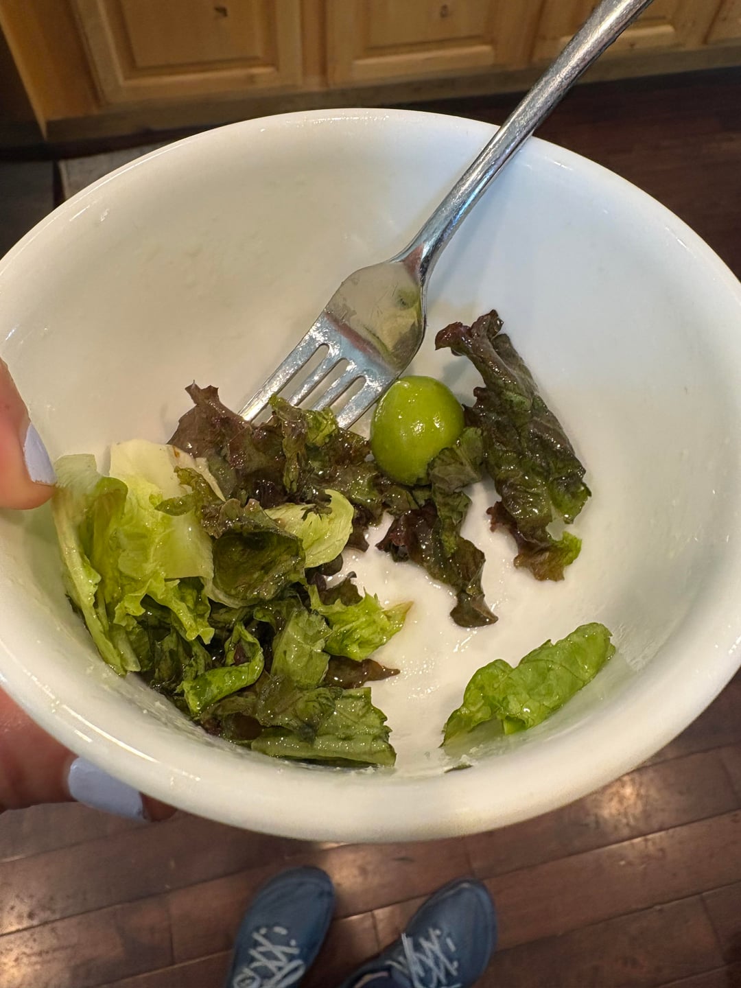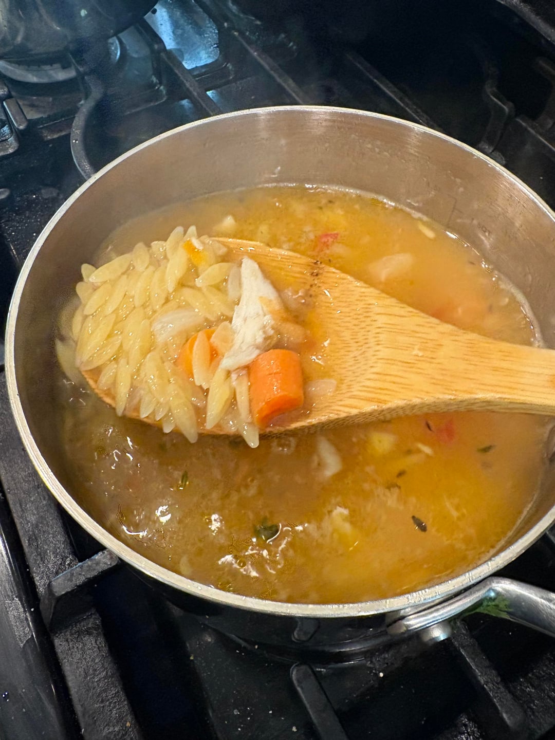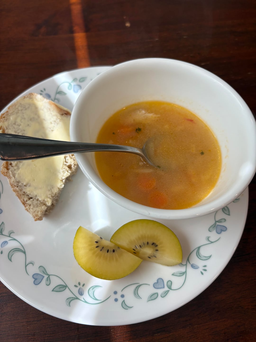Yesterday I made avocado toast on Ezekiel bread and added leftover slaw from fish tacos I had made before. Lunch was chicken with orzo soup. For the soup I boiled the bones of a rotisserie chicken to get the broth then I sautéed onion garlic carrots and fresh thyme . Added the broth and orzo and cooked. On the side had golden kiwi and homemade whole wheat sourdough with butter.