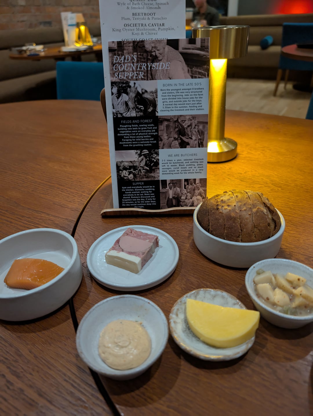 4. Lovely bread, nice sweetness. Softly smoked salmon, nice bit from the potato salad, spiced cream cheese. Lovely course with a great story behind it