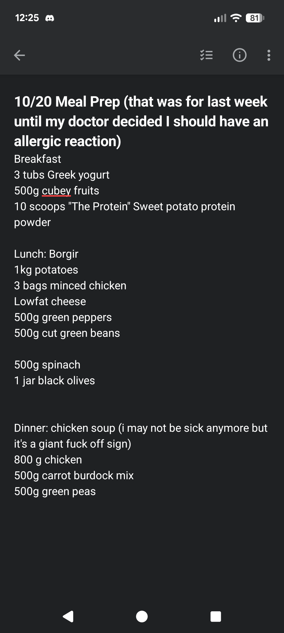 Sickness + Being given medicine I’m known to be allergic to finally made meal prep impossible last week…but I return! Not stronger, just angrier.