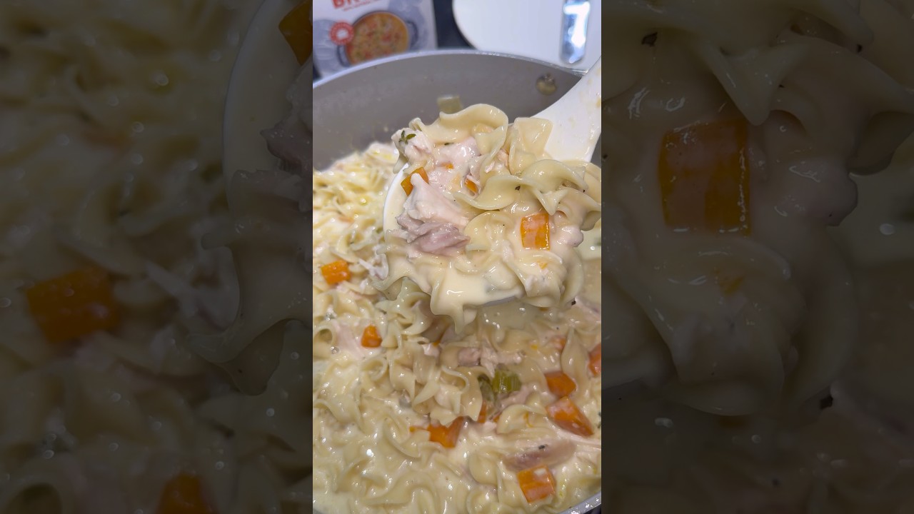 There is nothing better than a nice big bowl of creamy chicken noodle soup on a cold day. This stuff is the best and it’s super easy to make, too. Saute your seasoned veggies and a little bit of butter. Stir in some flour and then you’re going to add some chicken stock and heavy cream. Season it. Bring it up to a boil. And then you’re going to add your egg noodles. Turn the heat down to a simmer and let it until those noodles are cooked all the way through. Then stir in some shredded rotisserie chicken. Reeseason it if you think it needs it. and you are going to have the best chicken noodle soup that you’ve ever had in your life. Try it.