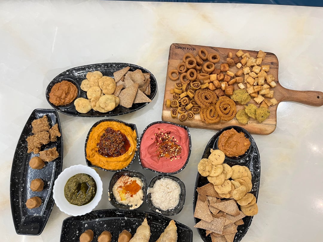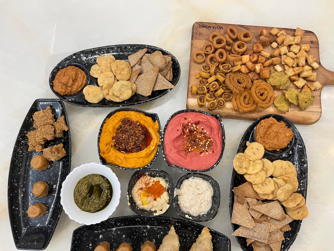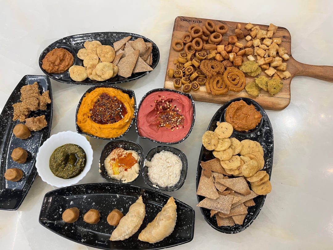 I created this platter for Our Diwali party . Includes classical Indian savouries like – Chakli , Papdi , Mathri , Kadbu , Namakpara . It also has baked Ragi chips . The dips are Mediterranean inspired- Claasical Hummus, Sun-dried tomato Hummus, Beetroot Hummus & Roasted Red Pepper dip – Muhammara . I made all the dips . Two store bought dips were Basil pesto & Garlic – Onion dip . It also includes Sweets like – Karanji , Besan Laddu & Coconut Burfi