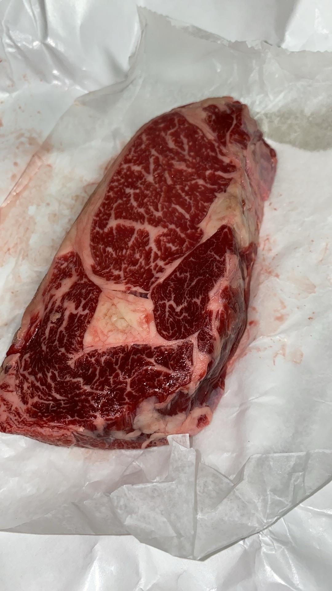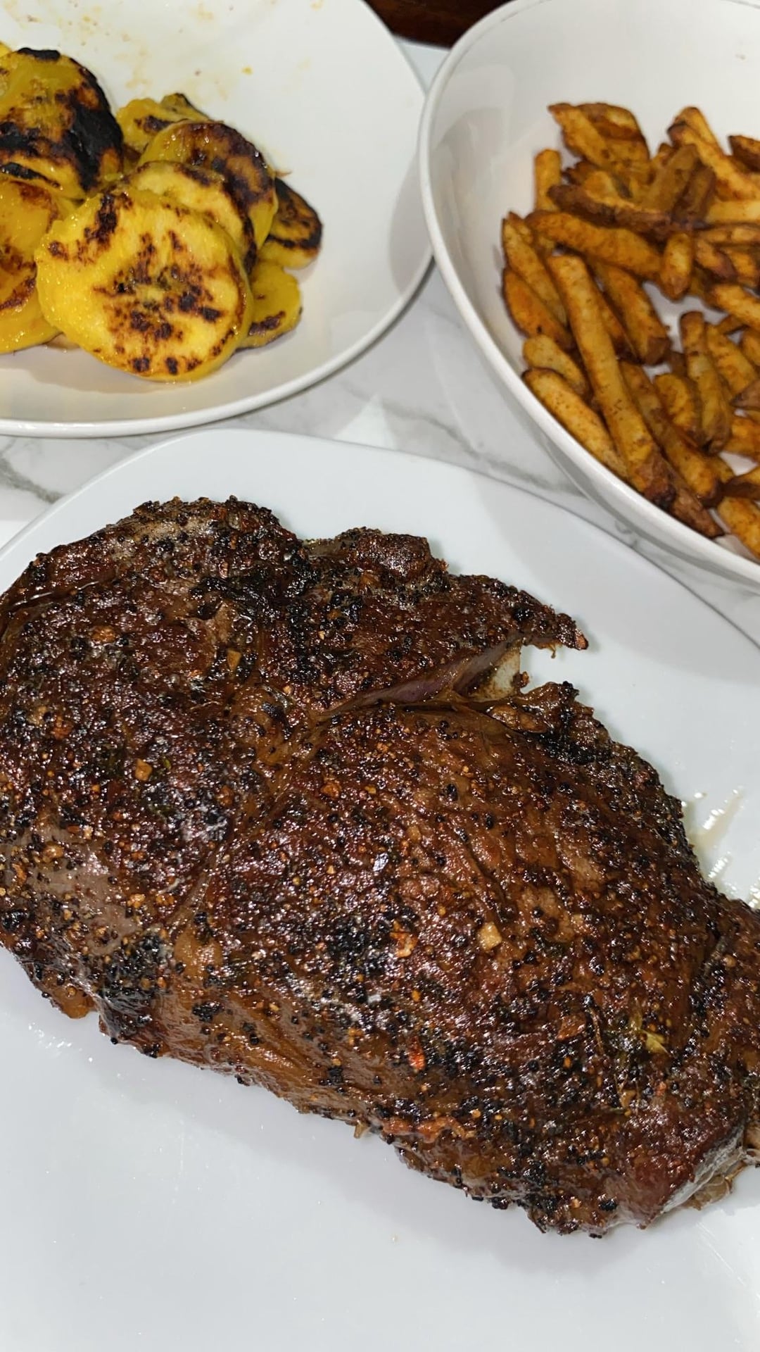 NATURAL GRASS FED NEW ZEALAND WAGYU BEEF BONELESS RIBEYE STEAK found at Central Market. Paired w/ fried sweet plantain + Cajun style fries