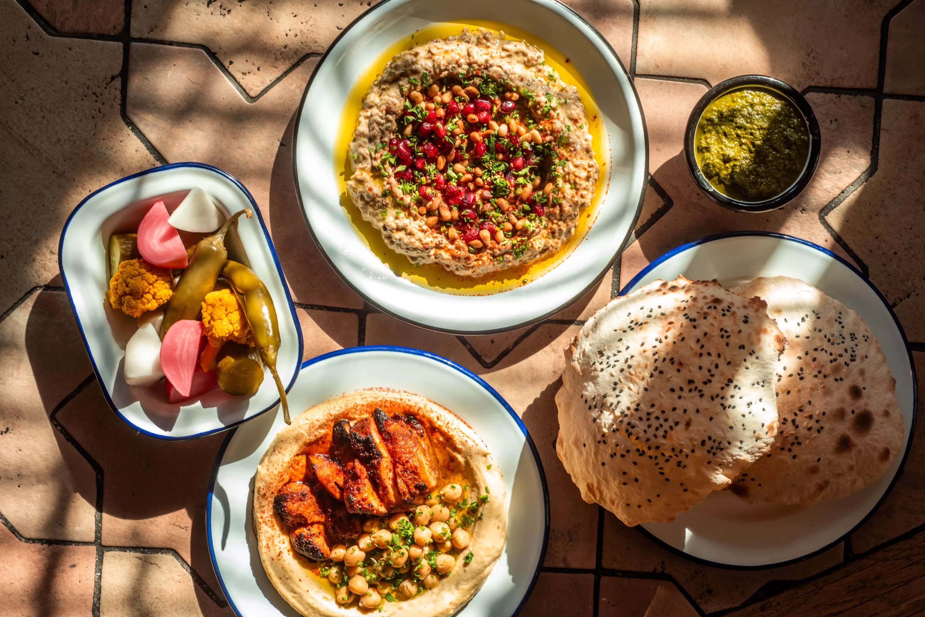 The mezze, or small plates, include falafel, pickles and several dips. There’s whipped labneh with zaatar honey, babaganoush, the spicy red pepper dip muhammara and hummus that can be jazzed up with zhoug sauce, puffed chickpeas or grilled harissa chicken. All of the mezze are served with house-made pita.
