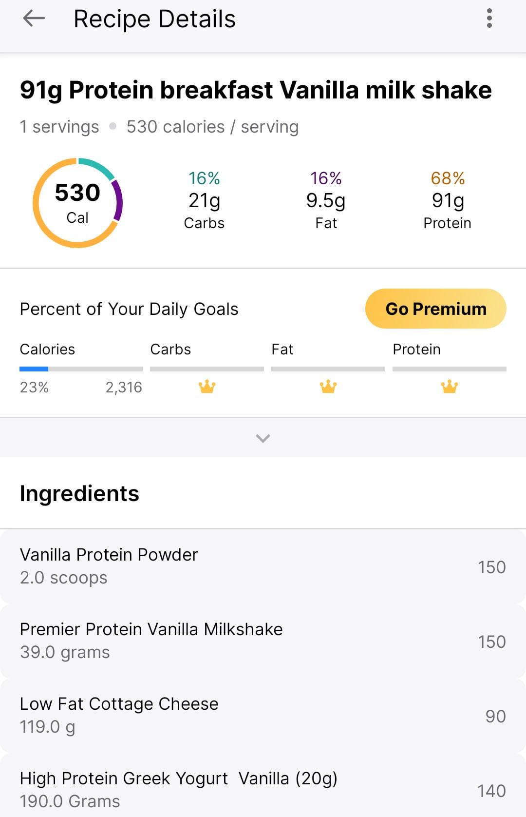 Breakdown is in the pic. Blend all ingredients together. It is super yummy and tastes exactly like a creamy delicious vanilla milkshake and between the yogurt, protein additives and cottage cheese, it is very filling! I can drink it at 7am and still not feel hungry by lunch (1pm) You can also add 2 shots of black coffee to it and it tastes like a fancy coffee shop coffee and give you a little caffeine boost to start the day. It is relatively high in carbs for just a "breakfast drink" but it really is a long lasting meal where you feel full for a while.