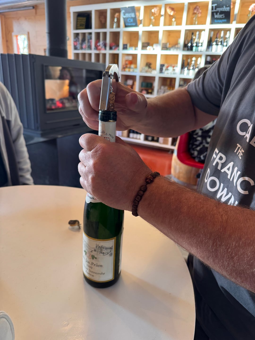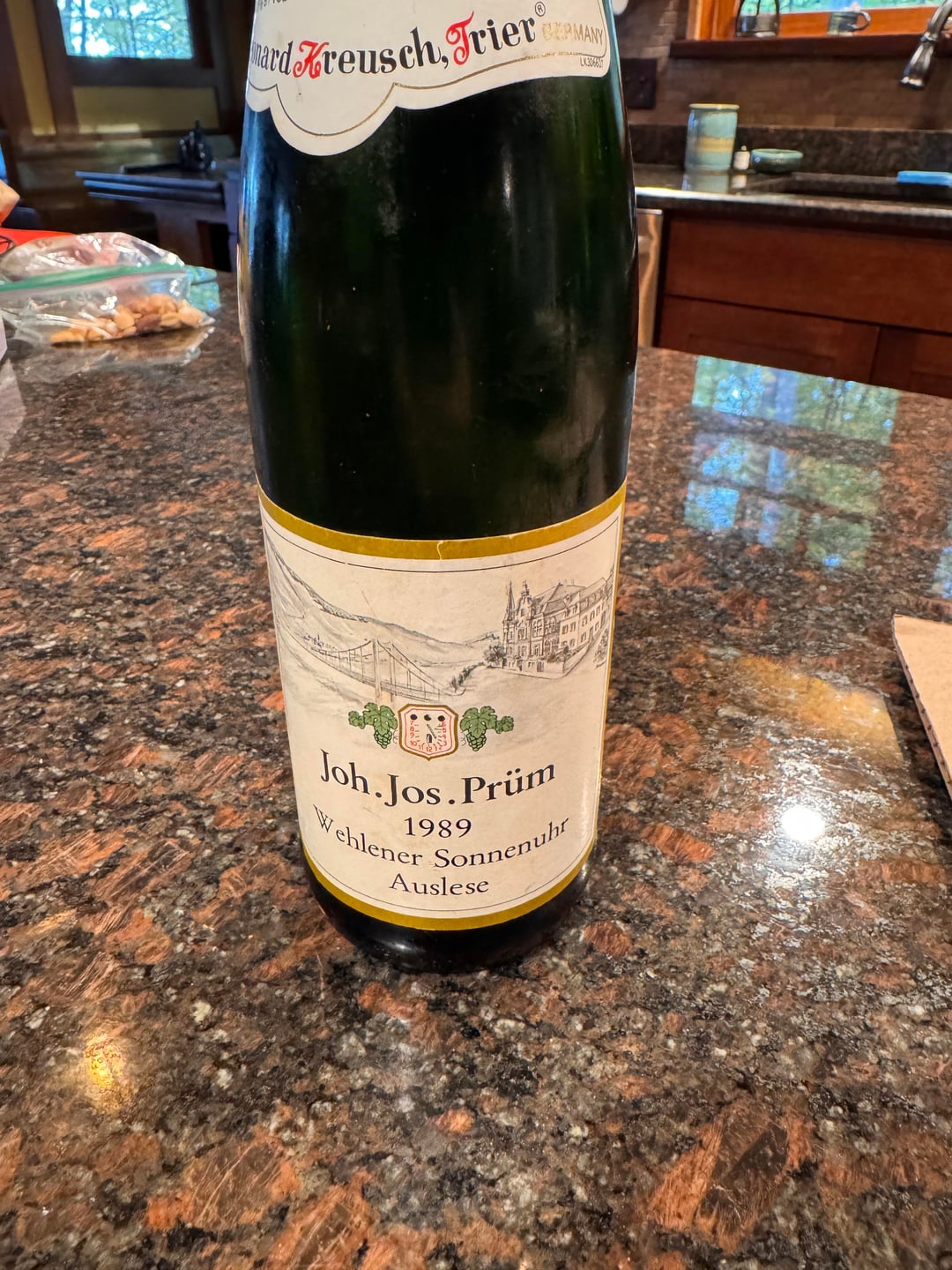 So we went back this evening with our friends for round 2 and drank the Prüm (and two Forge flights and some nosh). That’s Rick opening the bottle, which he did perfectly with the cork firm and intact. An aroma of honey and apricot and light petrol was apparent right away.
