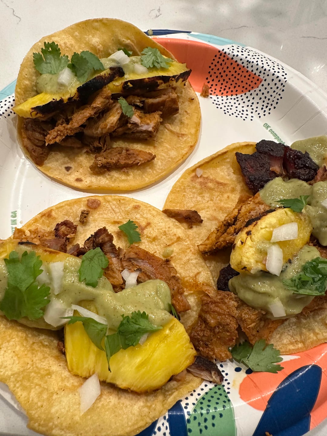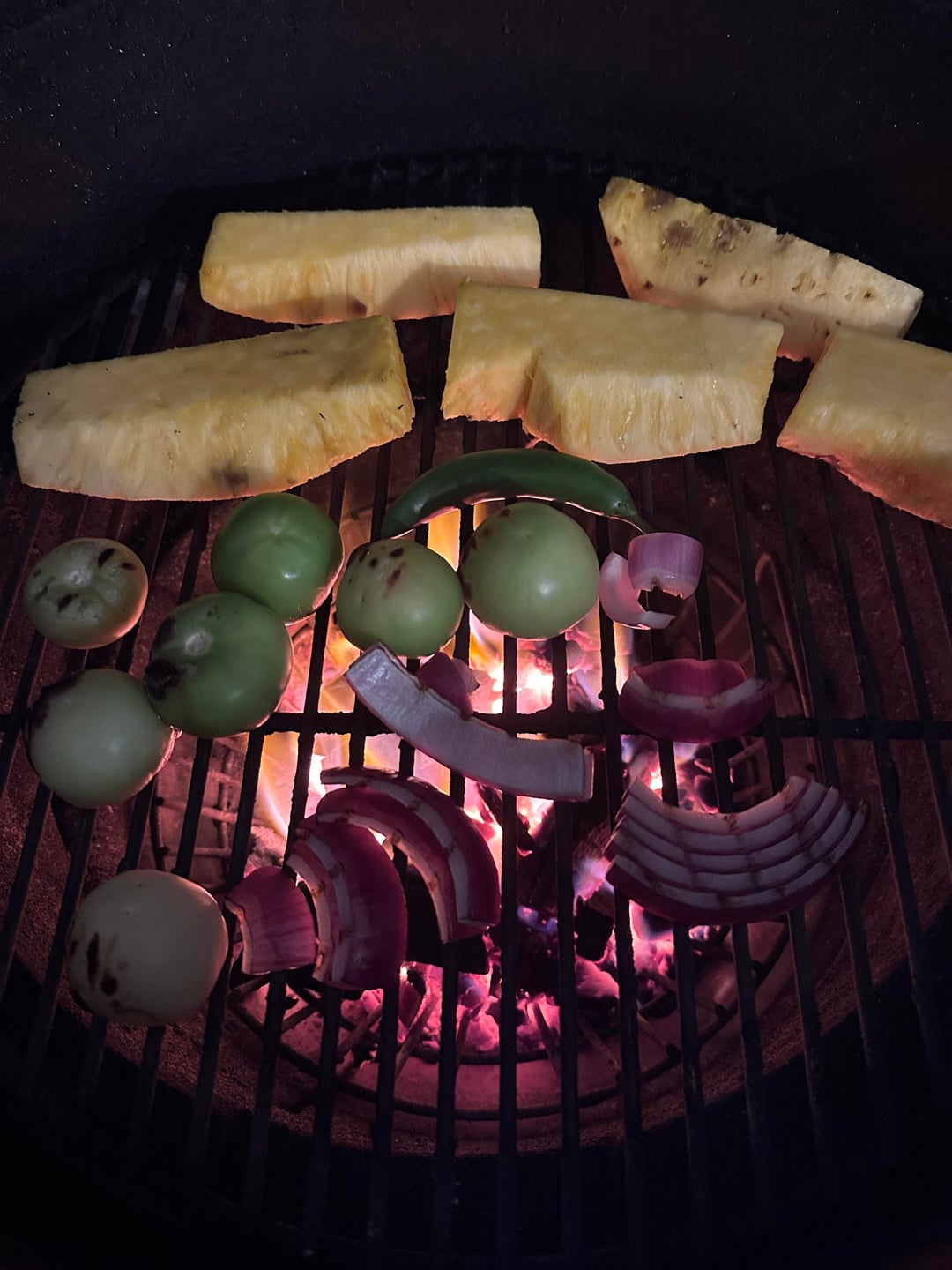 Sliced and pounded out the pork butt yesterday. Marinated overnight. Cook at 275 degrees until it reached 195. Then removed the deflector plate and cranked up the heat to roast the vegetables for the salsa verde and the pineapple. I planned on throwing the corn tortillas on the grill, but it was getting late so we did them in skillet while the vegetables cooked. Served with pork, grilled pineapple, salsa verde, diced raw onion and cilantro leaves.