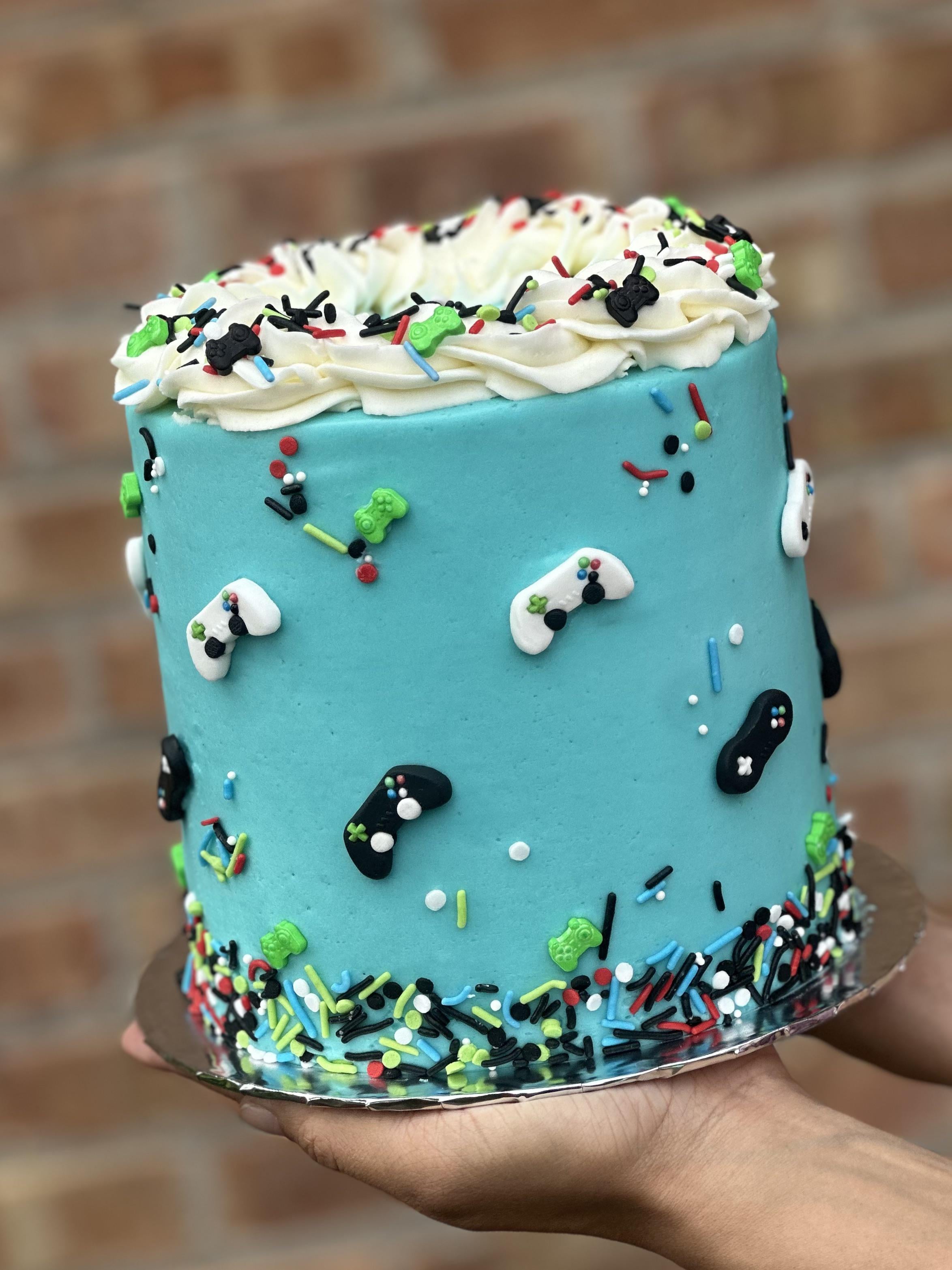 I got the larger controller pieces and the themed sprinkles from Michaels. It’s a 4 layer white cake with Oreo crumble in the batter and layers. I use American buttercream for the outside.