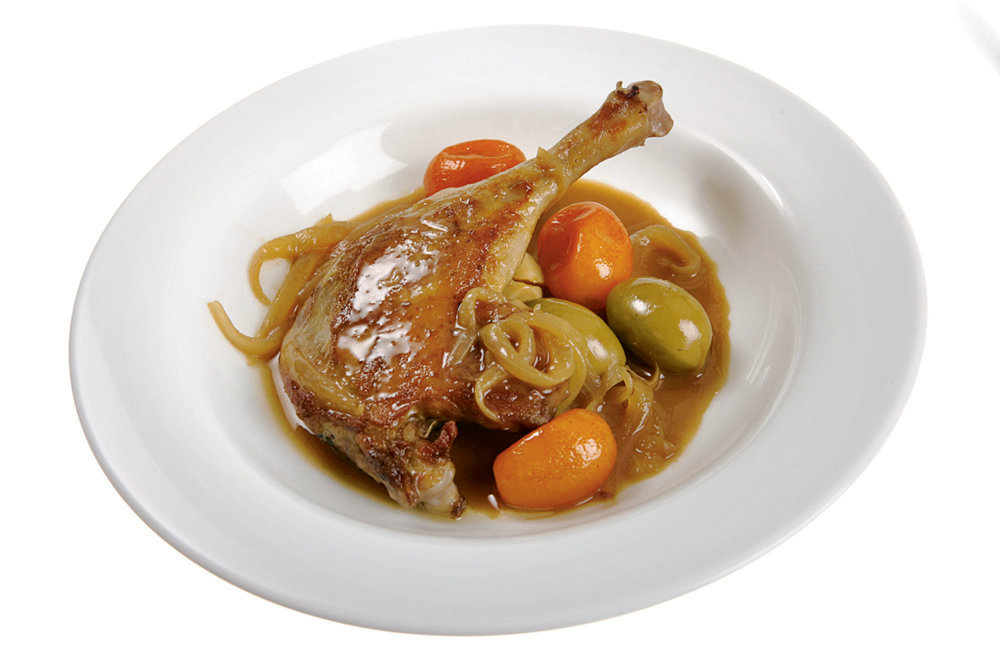 - Let the duck cool in the broth, then remove the duck, kumquats, olives, onions and bay leaves and set aside. Skim the fat from the broth, then reheat the broth, reducing by half. Season to taste with salt and pepper. Return the duck and its accompaniments to the pan to warm through. Place a piece of duck on a plate, topped with olives, kumquats, onions and sauce.