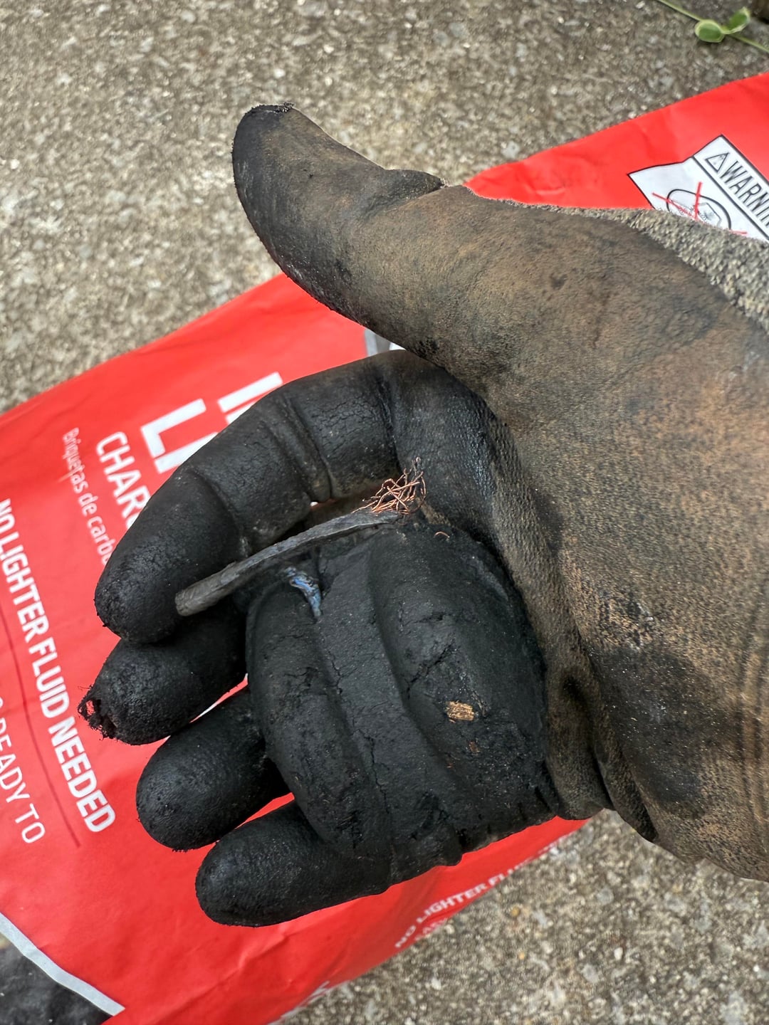 The first(and only) bag of Big Green Egg lump that I bought had a small football size of fiberglass insulation. It’s crazy what gets into these bags.