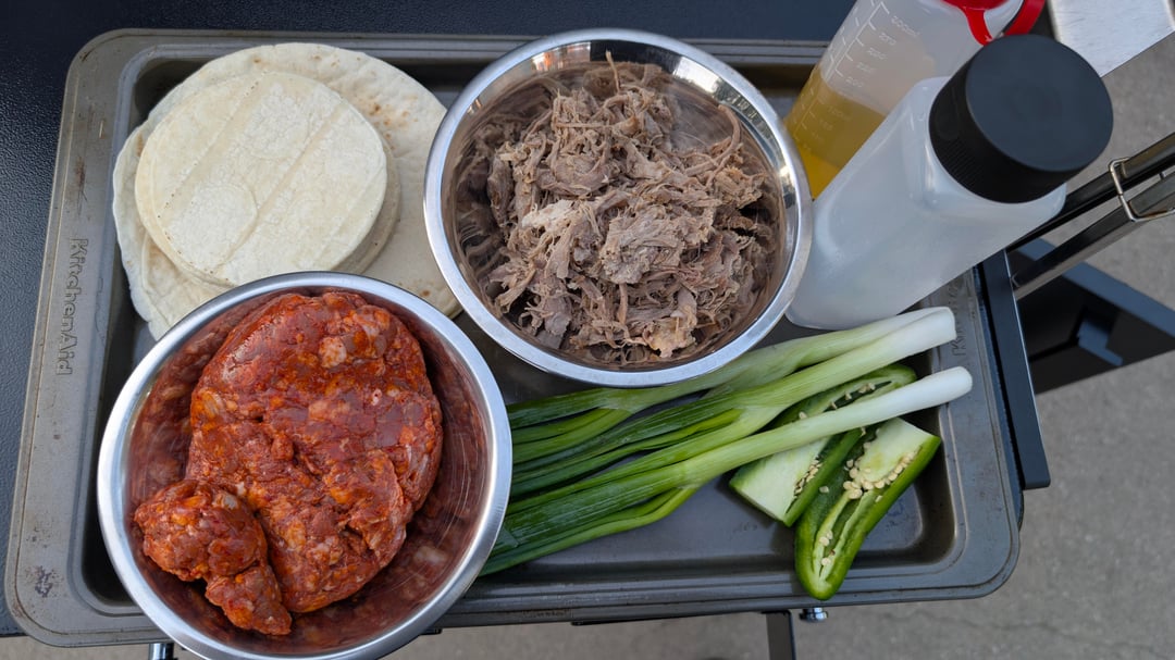 Made a pork roast Thursday and got the craving for tacos so I swung by the Mexican market on the way home Friday evening and stocked up. Corn tortillas, jalapeños, green onions, limes, salsa taquera, pre-marinated el pastor and some chopped carne de taco with a container of red seasoning and a mango for the kid. Froze the beef since I already had pork from carnitas.