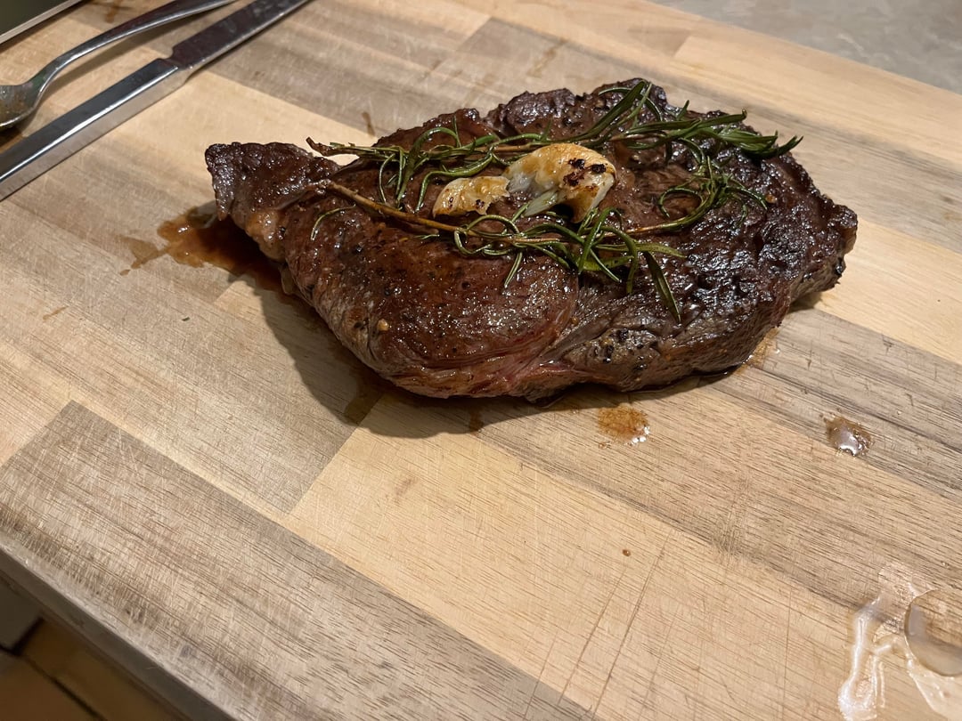 Cooked on a cast iron skillet, in beef tallow, salt, pepper, garlic. Finished with some garlic, kerrygold butter and rosemary from our herb garden.