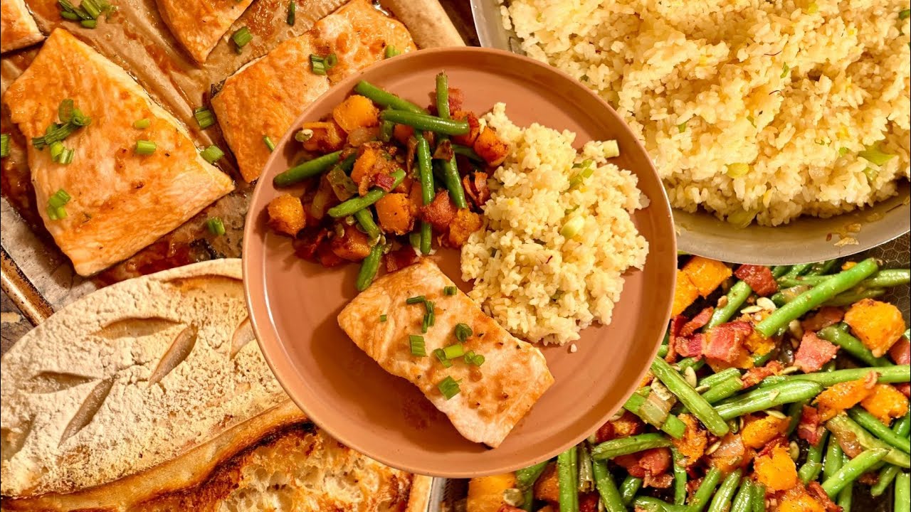 Hi everyone, Elsie Jensen here. Tonight we are going to bake up a loaf of sourdough bread. We’re going to make some maple glazed salmon, a lovely squash, green bean fall dish with some um saffron rice. So let’s start by getting our sourdough loaf out. had this one kind of cold proofing in the fridge for I want to say this one’s been close to three days, which is like on the max end of it. So, I’m going to have to help it out of its little basket a little bit more, but it will still bake up wonderfully. Here we go. There we go. Let me slide this guy over here. So then we’re going to give it a nice score and a simple design. There we go. And like to do it pretty deep. And then we’ll do our classic. Here we go. Yeah, good enough. Okay, let’s pop this in our heated Dutch oven. So, my Dutch oven’s been preheating with my oven as it’s been up to 500. So, it’s been in there for about oh, I want to say like 40 minutes cuz you want it to be nice and toasty warm. That’s going to make this a nice little toasty hot bread oven and it’s trap in that moisture and make it delicious. So, put the lid on. We’re going to bake this at 500° for 20 minutes. Then we will take the lid off and we’ll bake it for 20 minutes at 450°. So, I’m going to pop this in here and set my timer for 20 minutes and let’s start prepping up our glaze and our veggies and whatnot. Okay, so we’re going to make a we’re going to mince up some garlic to start for our maple glaze and then we will slice up some onions and start caramelizing them. Here’s my garlic. So, I’m going to grab a couple cloves of garlic out of our bag here. Um, and I’m going to mince it up. And then we will cook it with some butter, add some maple syrup, a little bit of um soy sauce, some onion powder, and some garlic salt. And that’s going to be the base of our glaze for our salmon, which will be just lovely. So, I want to use fresh garlic so that we just get that wonderful flavor in there. And I’m going to mince it up, you know, pretty, you know, not to a paste, but pretty good size. Um, and this will add some just lovely garlic flavors. And I feel like the maple, the garlic, and the soy are just or soy sauce are going to just work really well together. Here we go. So, we’ve got it fairly minced up and we’re going to add our butter into our little dish here. I don’t need a whole lot of butter. Um, but I do have uh seven goodiz salmon fillets. So, I’m going to probably do about two tablespoons of butter in here. We’re going to let that start to melt and then we will add in our garlic. I do want my base of my pan to be melted with some butter first before I add the garlic in so I don’t um end up like burning it. We’ll also add a little bit of lemon juice to our um marinade. Okay, I’m going to add this to the side. And while we’re prepping for that, I’m going to dice up some onions. Um, we’ve got a big yellow onion here. Part of this is going to go with our veggie dish, and part of this is going to go with our saffron rice. So, we’re going to use, you know, a little half and half and take off this whole outer kind of layer here. And I’m going to do two different types of cuts on our onions. So, for the ones that are going to go with our green beans, our butternut squash, um, and our bacon there, I’m going to do a slightly bigger dice on it so you have nice kind of bigger chunks of onion. And then for the one for our saffron rice, we’re going to do a u more of a smaller mint to it. I’m going to slice it up nice and thin. And then we’ll cut it up. So it’ll be smaller pieces that will kind of blend in with the rice. There we go. And again, this is a really big onion, so it’s actually probably the same as two smaller sized onions. There we go. And now that our butter has melted over there, I’m going to turn my heat down to low because I don’t want my butter to brown. Um, really just to kind of melt so it can start infusing some of this garlic in it. So, we’ve got kind of like our tablespoon of minced up garlic here. Okay. We’ve got our onions. I’m going just grab dice up some of these smaller pieces. There we go. And that is going to be for our risoto. But before we get that kind of going, let’s start sautéing up our bacon for our um squash because we’re going to cook our um butternut squash and our green beans in this lovely bacon. I’ve got some thick cut bacon here, which will give it make it a little bit heartier than the thin cut. Now, I’m not going to be using all of this bacon because this is a lot of bacon. Um, but I’m going to grab a couple slices out here um to sauté it up. It’ll give it great flavor. Um, and we can use that fat to really crisp it up. So, I’m going to probably grab, let’s see, I’m going to do four slices of this thick bacon here, which is probably, if you were going to use a regular size bacon, it’s probably closer to six slices because this is pretty thick. And then I’m just going to slice it up into nice using my kitchen shears here. find it’s a little bit easier to cut up the bacon with this than it is um with a knife. And that way I’ll have nice kind of bigger chunks. I don’t want them to quite to be as small as bacon bits, but a little bit bigger. Um and a little bit I don’t want them to get too crunchy, but more of like a chewy crispy texture to it. Let me wash my hands real quick. Okay. And let’s get that starting to kind of cook up over here. And what we’re going to do while we’re waiting, we’re going to start caramelizing our onions for our rice. So, I’m going to add in about I want to say maybe a tablespoon and a half of olive oil over here. I’m going to turn my temperature down to about a four. And we’ll add in our minced up onions and let those kind of caramelize and bring out their nice flavors. There we go. And let me grab a spoon so we can give this a nice stir and kind of coat it up. Okay