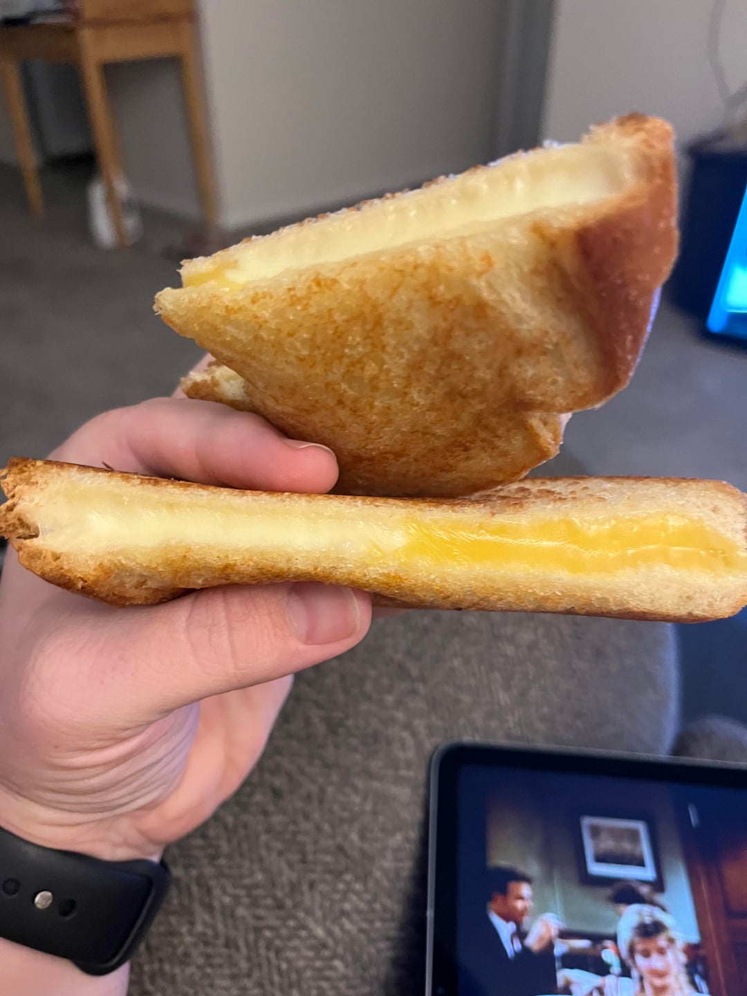 Needed a late night snack so I made me a couple of grilled cheeses. Ate the first one and took a bite from the second one before I decided to snap a couple of pictures.