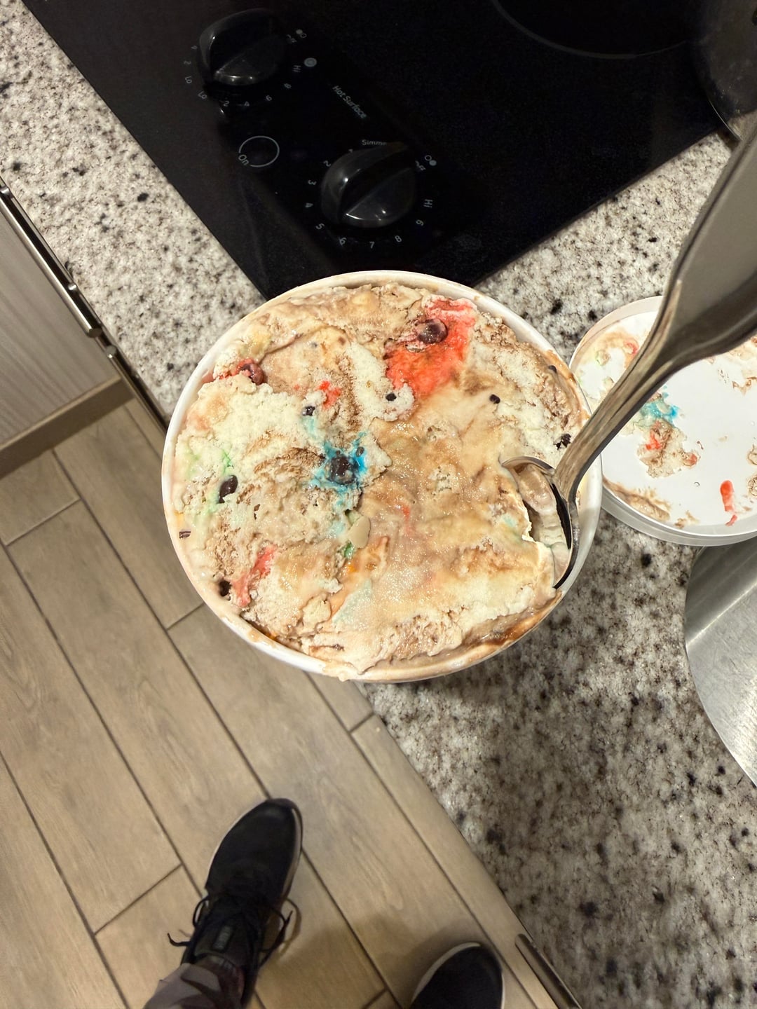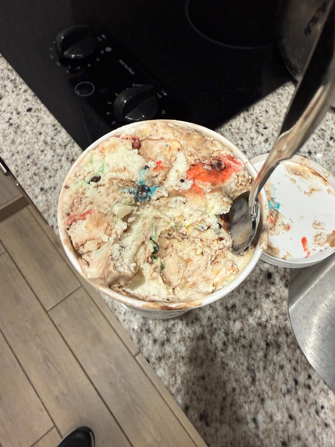 Trash can (vanilla base with Oreo, m&ms, butterfingers, caramel and fudge, chocolate crunchies, and graham crackers) from Hayners Ice Cream in Clifton Park, NY.