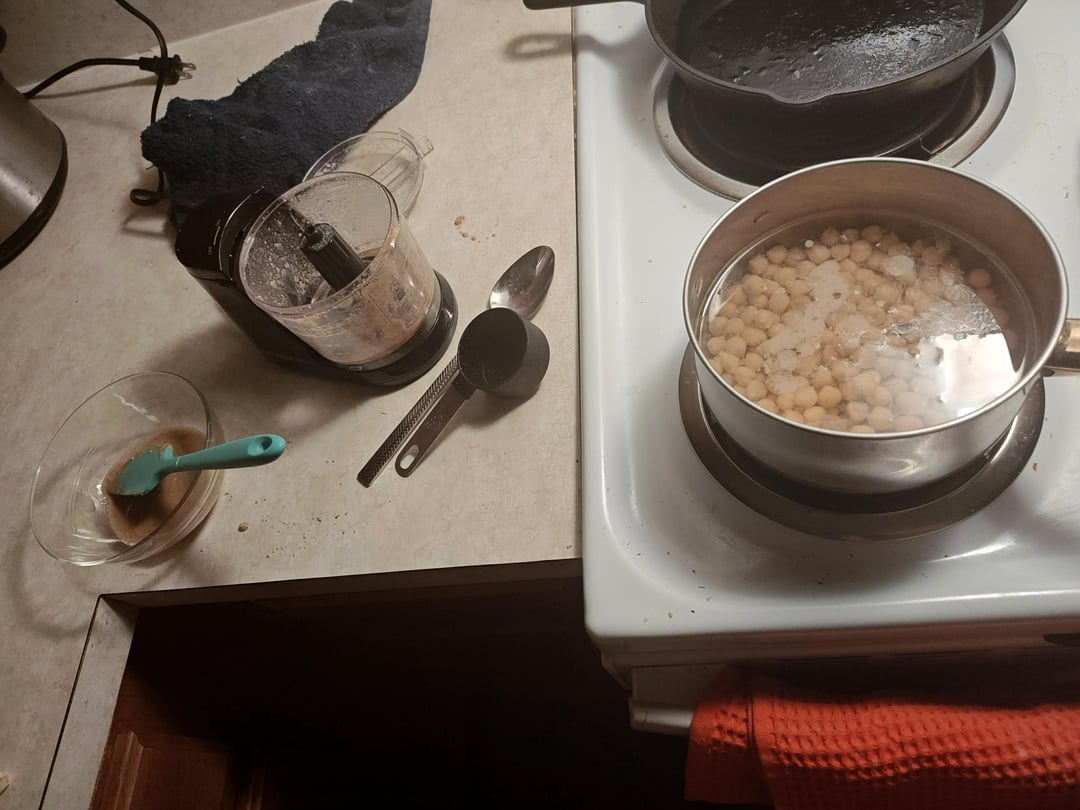 So I whipped up tahini, set aside. Simmered chickpeas on the stove w baking powder and water.