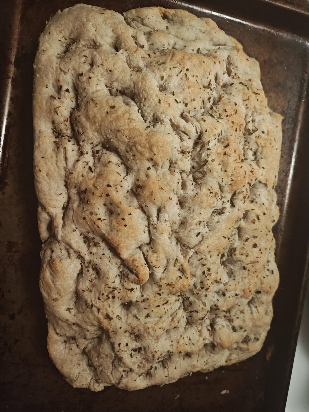 Focaccia is baking at 425 for about 25 min. Slides out ok but there's no big air pockets, idgaf now baking stresses me out but it's still legally bread. A touch dry. I won't make the British baking show anytime soon. But it's bread and salted and oiled enough to be a good time