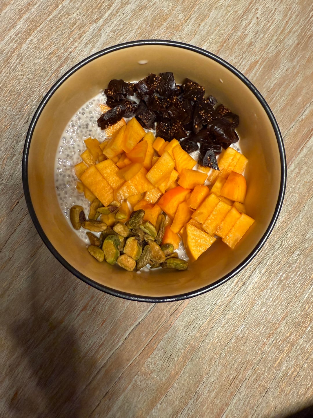 3. Chia seed pudding with cashew milk, persimmons, dried figs, pistachios. And spiced with vanilla extract and ginger powder. Should have added cinnamon. The leftovers became breakfast with plain yogurt, granola, and more nuts.