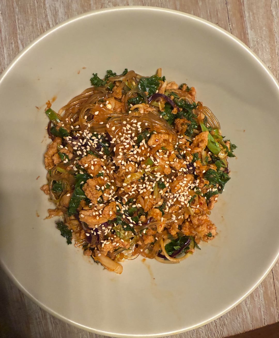 2. Gochuhang chicken with glass noodles and shredded crucifers. This is a close enough one, these are korean sweet potatoes noodles. I sauteed some ground chicken with onion, garlic, and ginger. Then added gochujang, soy sauce, and sesame oil. I added a little chicken broth concentrate and some water to finish the pre-cooked noodles. And threw in the shredded crucifers from Trader Joes – kale, cabbage, and brussels. I topped with toasted sesame seeds. This experiment turned out great.