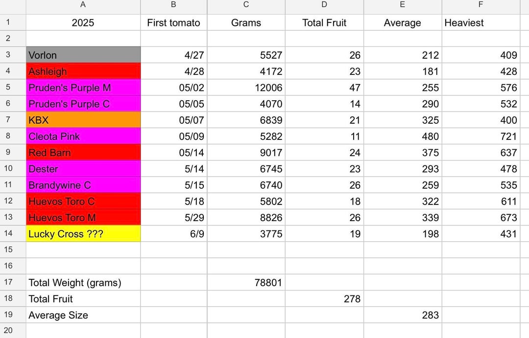 Great year here in 9b Texas for tomatoes that ended in August. Best for flavor, Pruden’s Purple, Brandywine Cowlick’s, Dester, and Huevos de Toro. Best single plant production, Pruden’s Purple. Worst tomatoes for flavor, KBX, the Lucky Cross impostor, Red Barn, and Ashleigh. Looking forward to 2026.
