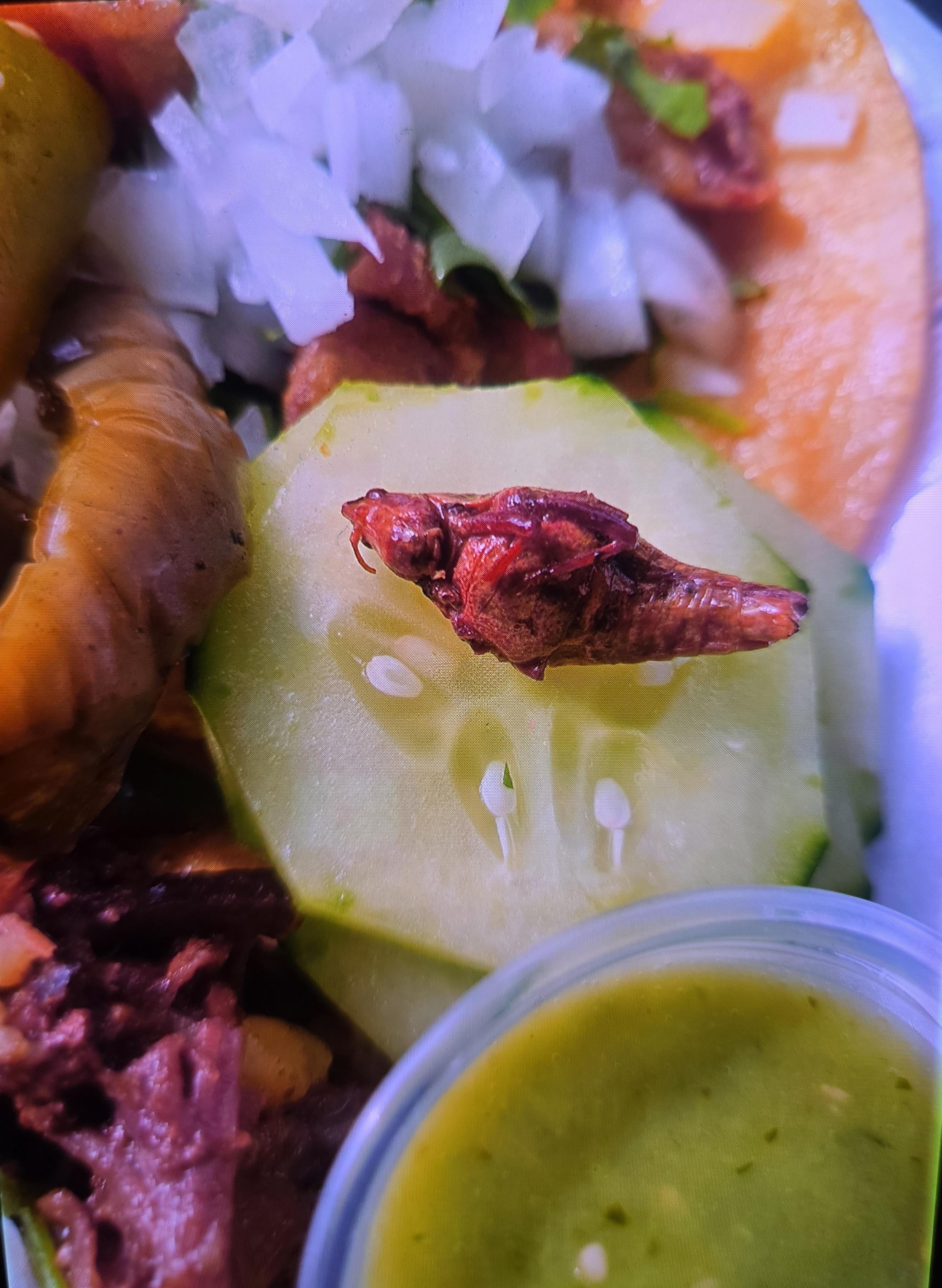 My taco guy have you tried eating insects? I was like I've tried it before overseas. I thought it was just a general question. Whips up my tacos and he had some special ingredients for me. Lol. Forgot what he called them. It's like a mix o tajin and smoked flavor. This was last year I came across it on my old phone. 😆