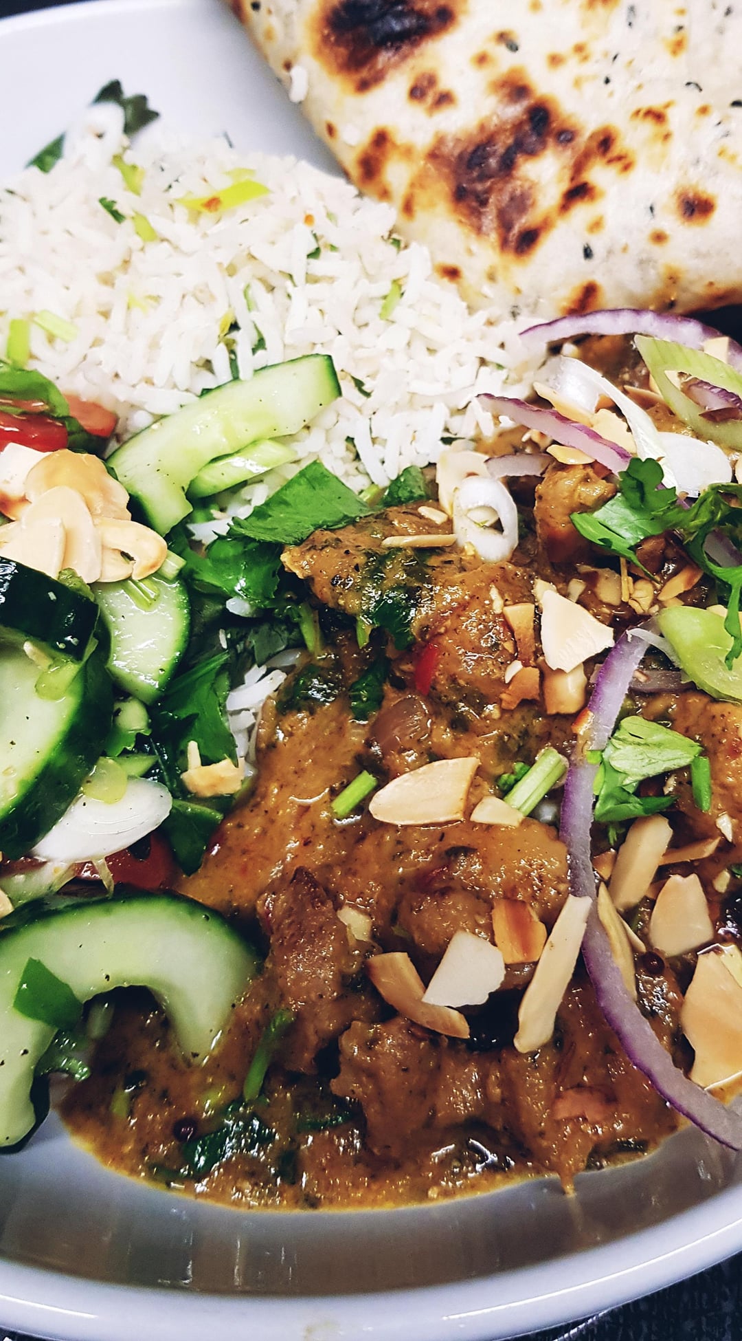 Homemade Pork Pasanda Curry, Lime Coconut Rice, Cucumber Salad and Flatbreads.